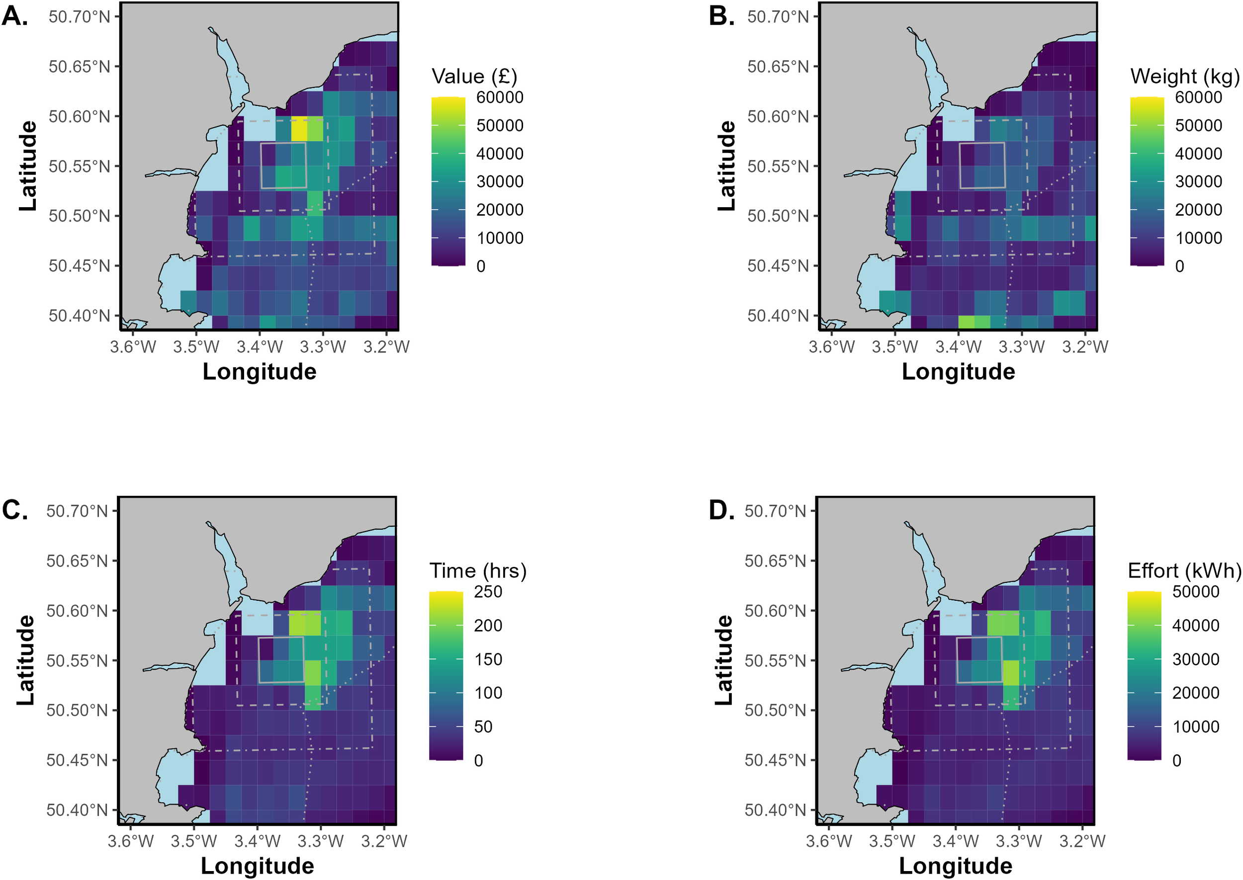 A heatmap of total (A) catch value (£), (B) catch weight (kg), (C) time spent (hrs) and (D) fishing effort (kWh) within the HypHPMA and surrounding areas during 2019, based on 0.025° by 0.025°C-squares. The solid grey box is the 25km2 HypHPMA, the dashed grey box represents the 100km2 surrounding area and the dot-dash box is the 400km2 surrounding area. The dotted grey outline represents D&S IFCA boundaries. C-squares containing fewer than 3 vessels have been removed from the analysis due to data sensitivity.