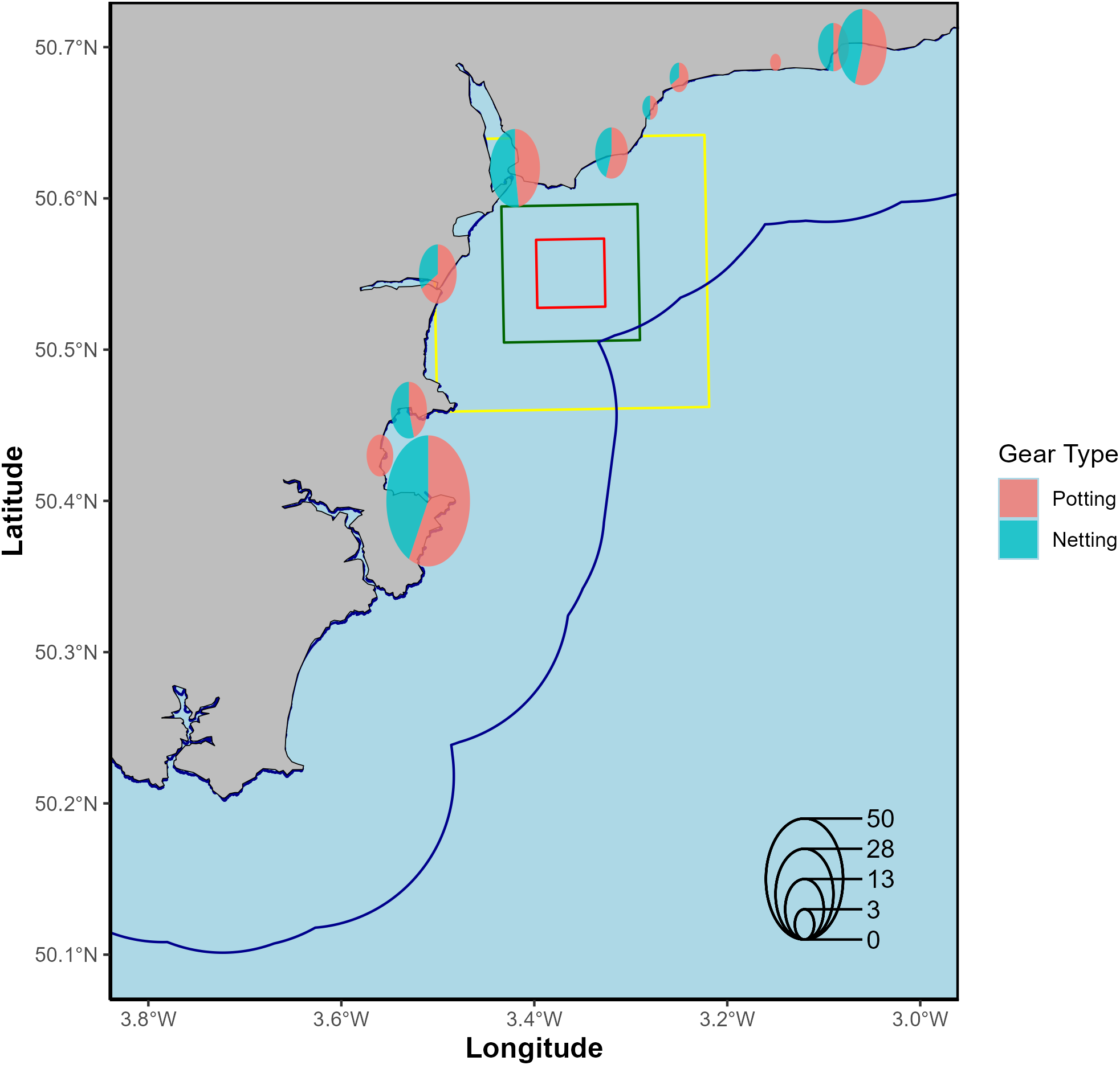 The number of static vessels that have been issued permits within the D&S IFCA, for ports close to the HypHPMA (within 20 n mi). The size of the circle represents the number of permits given, whilst the colour of the circle represents the proportion of each gear type (potting or netting). The red box represents the HypHPMA, green box represents the 100km2 surrounding area and yellow box is the 400km2 surrounding area, used as a comparison within habitat and displacement assessments. The dark blue outline represents D&S IFCA boundaries.