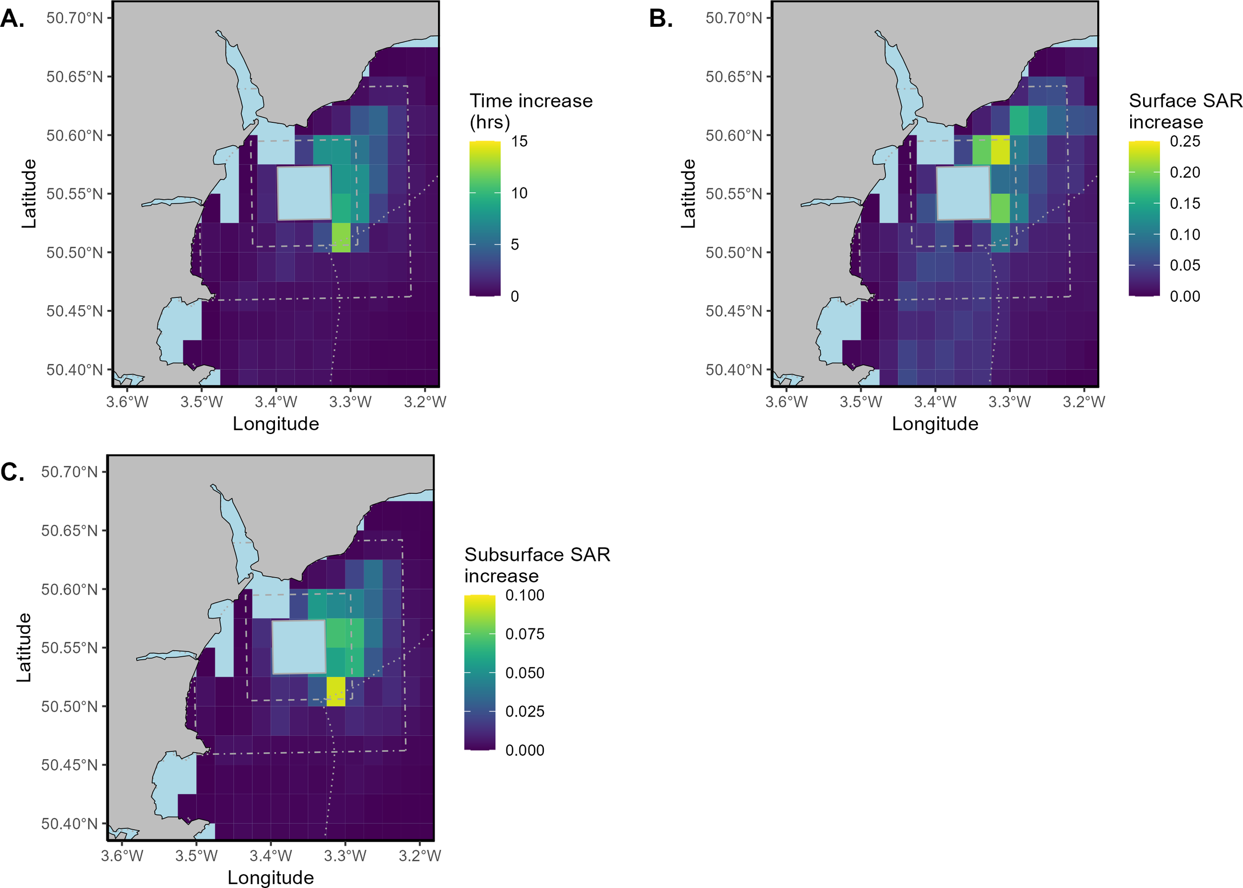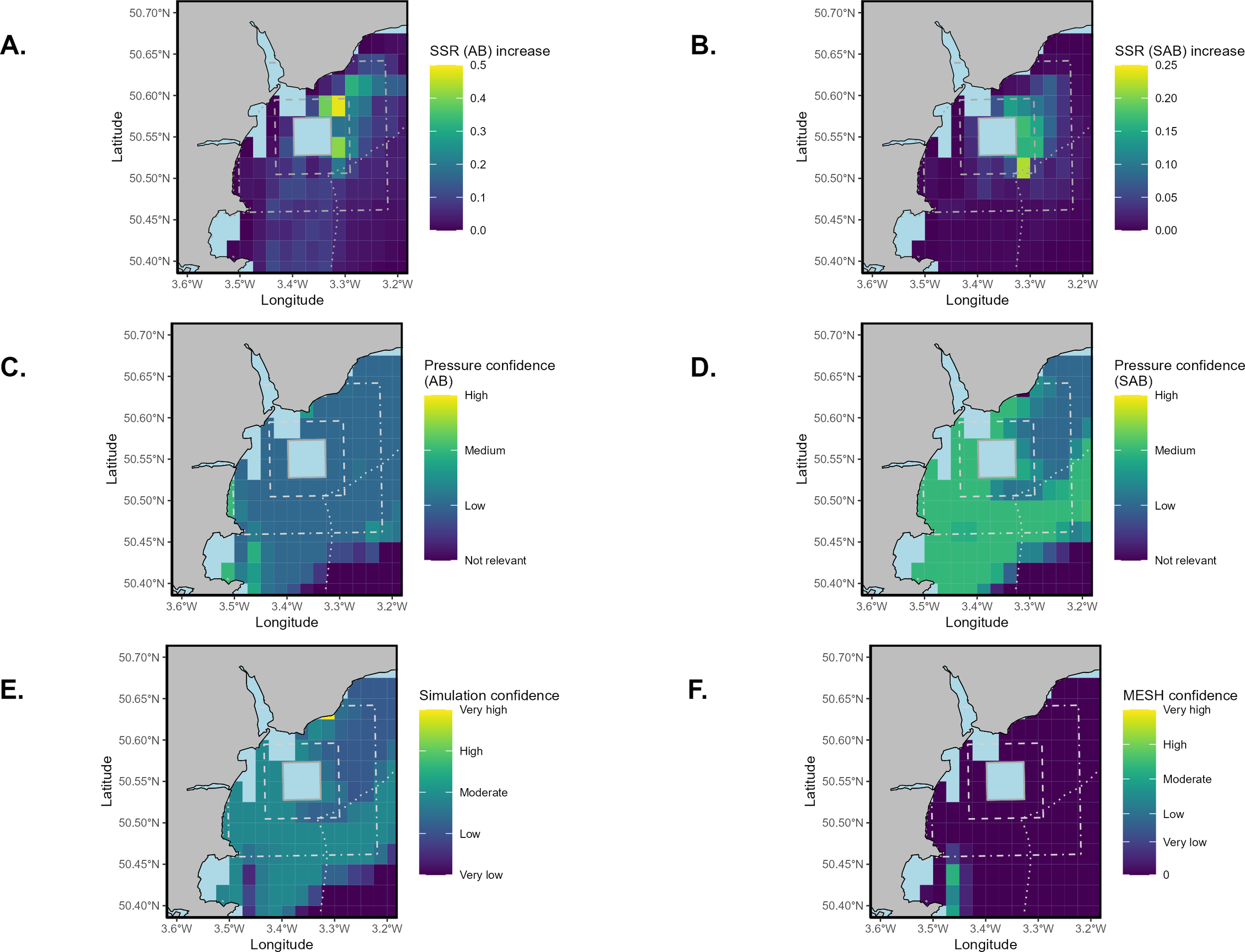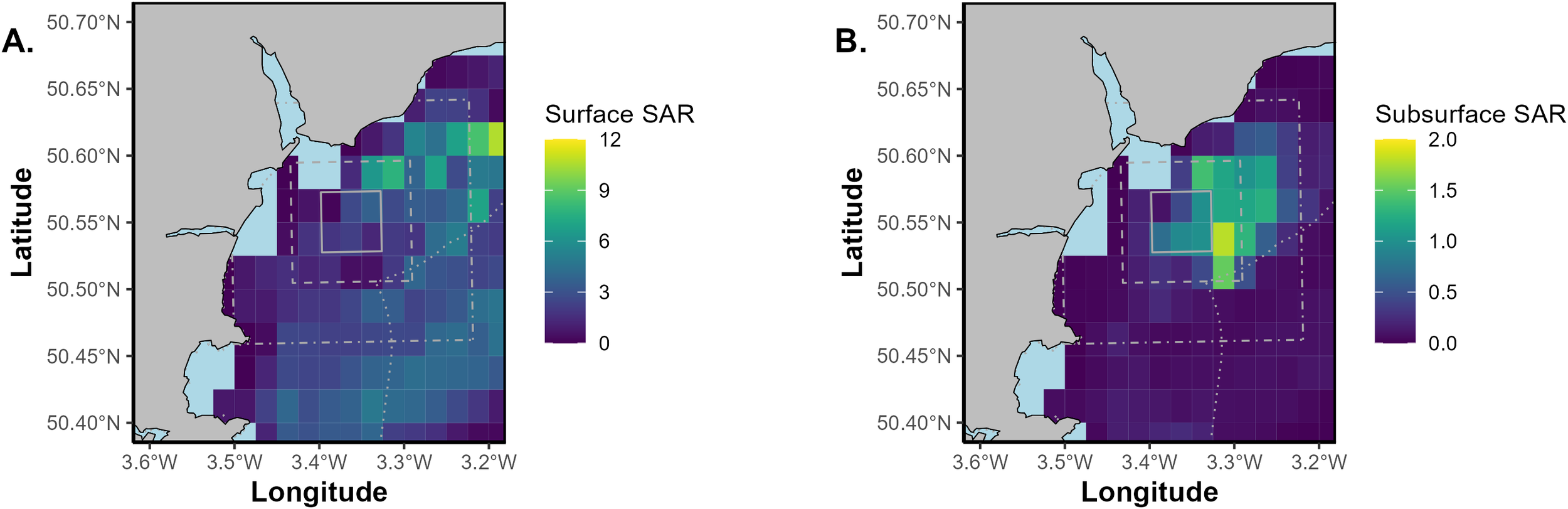 A heatmap of total (A) surface swept area ratio and (B) subsurface swept area ratio (>2cm penetration into the seabed) within the HypHPMA and surrounding areas during 2019, based on 0.025° by 0.025°C-squares. The solid grey box is the 25km2 HypHPMA, the dashed grey box represents the 100km2 surrounding area and the dot-dash box is the 400km2 surrounding area. The dotted grey outline represents D&S IFCA boundaries. C-squares containing fewer than 3 vessels have been removed from the analysis due to data sensitivity.