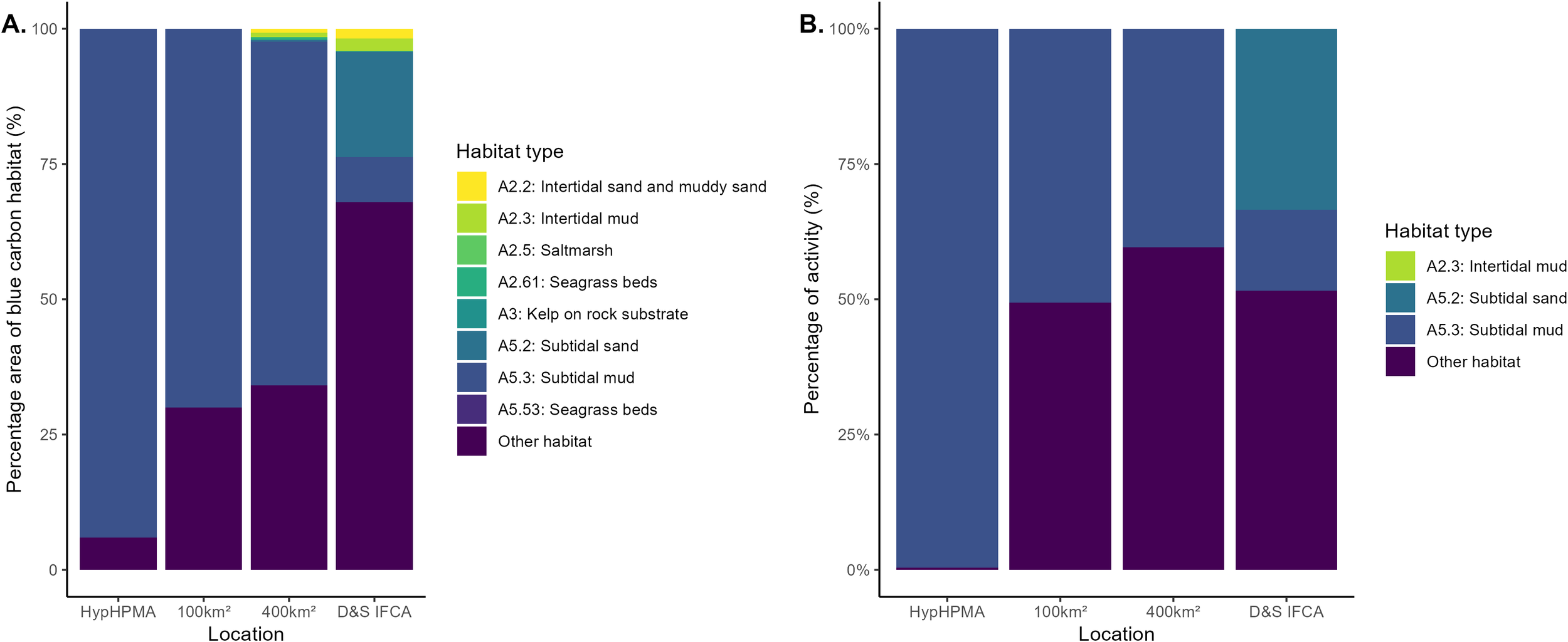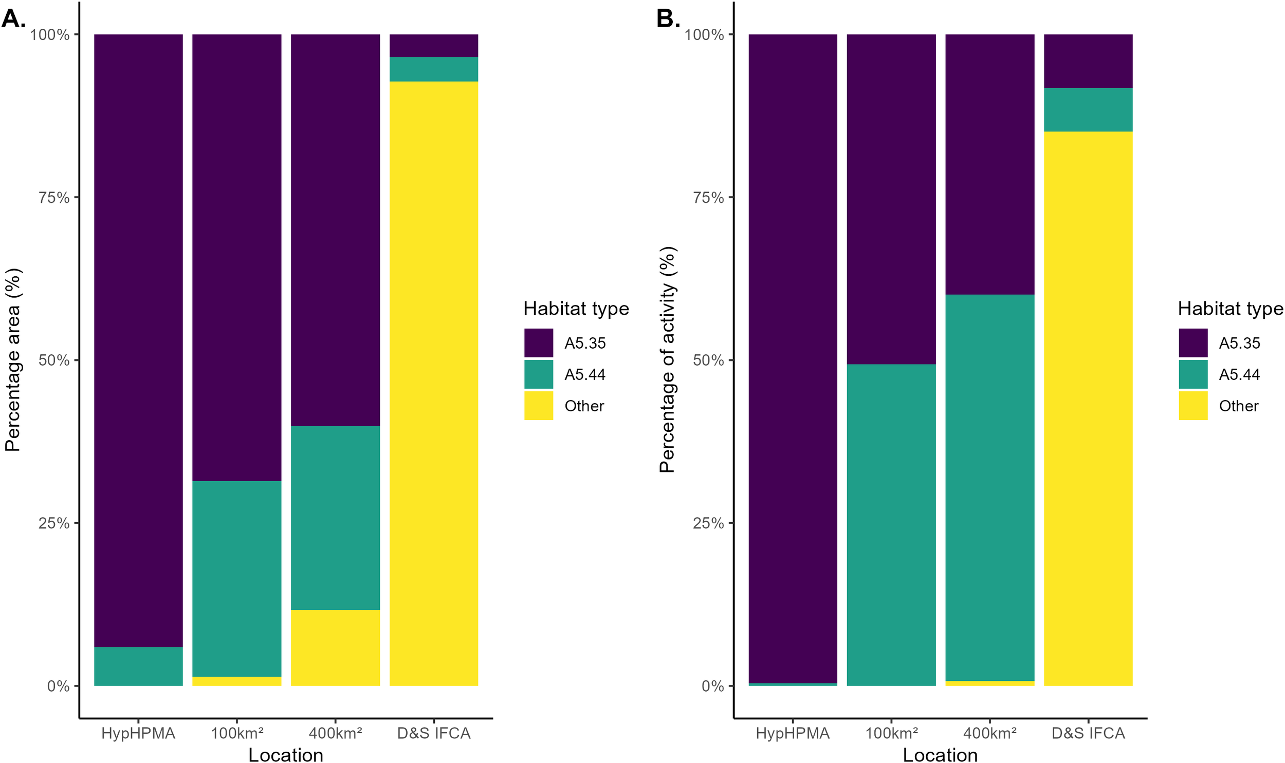 (A) Percentage of area covered by different EUNIS benthic habitat types within the HypHPMA, 100km2 surrounding area, 400km2 surrounding area and within the D&S IFCA boundary, (B) Percentage of fishing activity (hrs), depending on EUNIS habitat code, based on time spent within the HypHPMA and surrounding areas. EUNIS codes: A5.35: circalittoral sandy mud and A5.44: circalittoral mixed sediments, Other: other EUNIS codes.