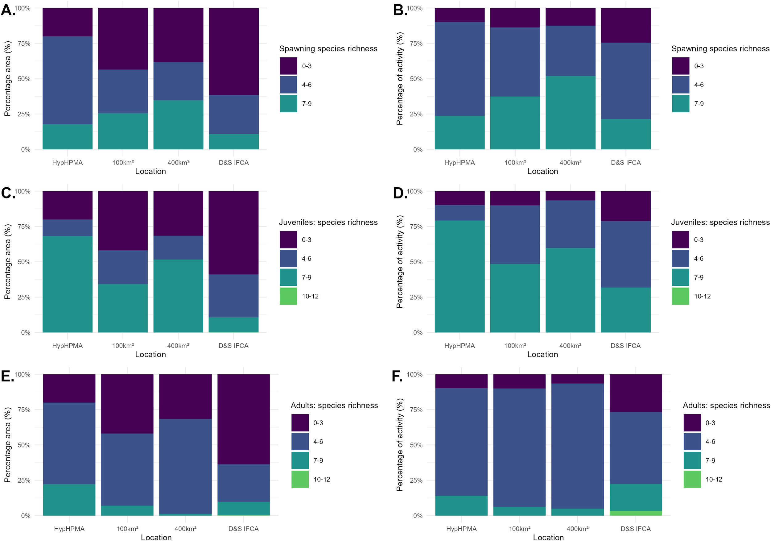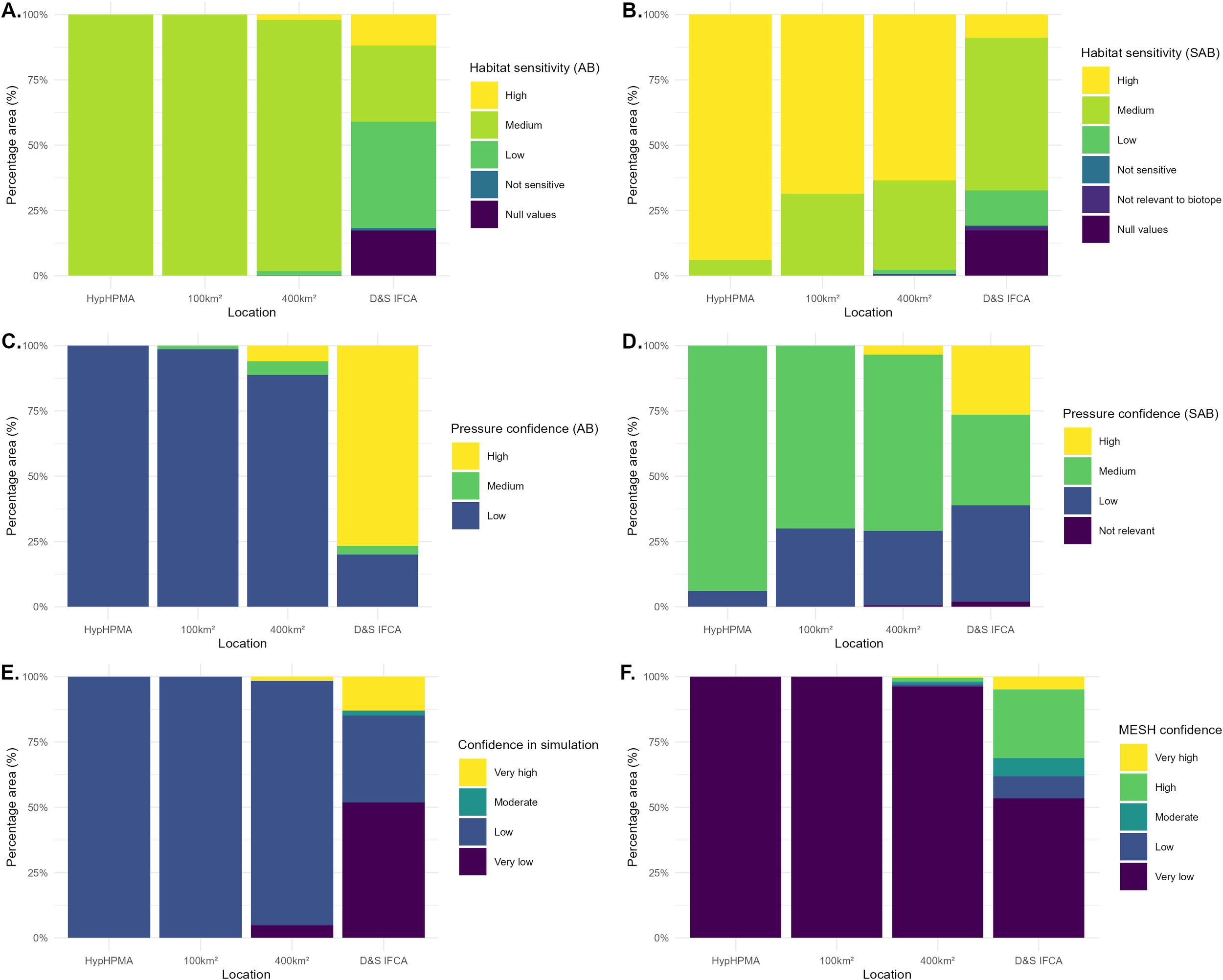 The percentage of area coverage by different benthic habitat sensitivities ranging from not sensitive to high sensitivity for (A) abrasion pressure from demersal trawling and dredging and (B) penetration pressure from demersal trawling and dredging. Confidences were also included for quality of evidence for resistance and resilience depending on the source quality, (C) for confidence in abrasion pressure from demersal trawling and dredging and (D) confidence in penetration pressure from demersal trawling and dredging (ranging from not sensitive to high). The (E) confidence in the simulation was also presented; a score (0 – 1) representing a quantitative estimation of the certainty associated with the biotope assigned to mapped habitat, alongside the (F) MESH confidence score, which represents the confidence in each of the mapping studies that make up the habitat map. These are presented for the HypHPMA, 100km2 surrounding area, 400km2 surrounding area and within the D&S IFCA boundary.