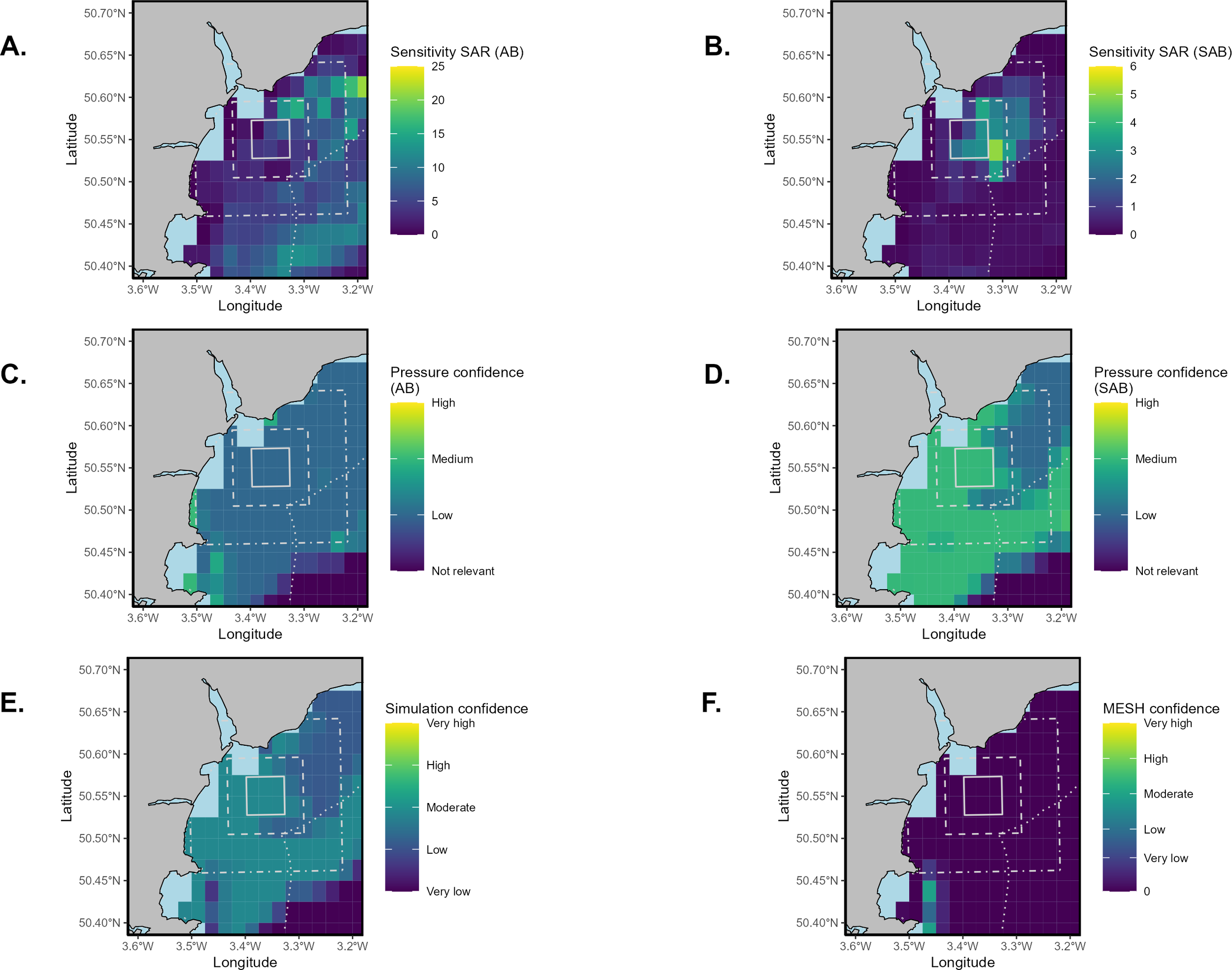 The SAR was calculated for 0.025 by 0.025 decimal degree grid cells using “VMStools” and plotted using “ggplot2” (Wickham, 2011). Any squares containing fewer than three vessels were not plotted due to data sensitivity. This occurred for both surface abrasion (AB), width of gear that came into contact with the surface of the seabed and subsurface abrasion (SAB), width of gear that penetrated >2cm into the seabed, this definition is used in multiple marine studies (Eigaard et al., 2016, Eigaard et al., 2017; Rijnsdorp et al., 2018). Gear width was assigned based on gear type, vessel length and most common species type caught. This was based on expert opinion from Seafish (Supplementary Tables S1, S2).