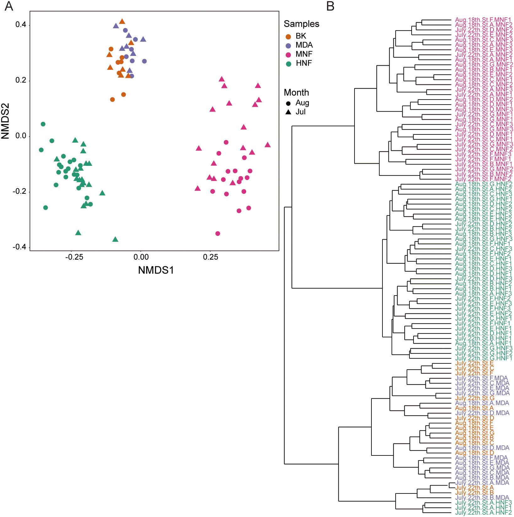 A two-part image consisting of a scatter plot (A) and a dendrogram (B). The scatter plot depicts NMDS analysis of samples, with colors and shapes denoting different sample types and months: orange circles (BK), purple circles (MDA), pink circles (MNF), green circles (HNF), with filled circles for August and triangles for July. The dendrogram clusters samples hierarchically, with colored labels matching the scatter plot for sample identification.