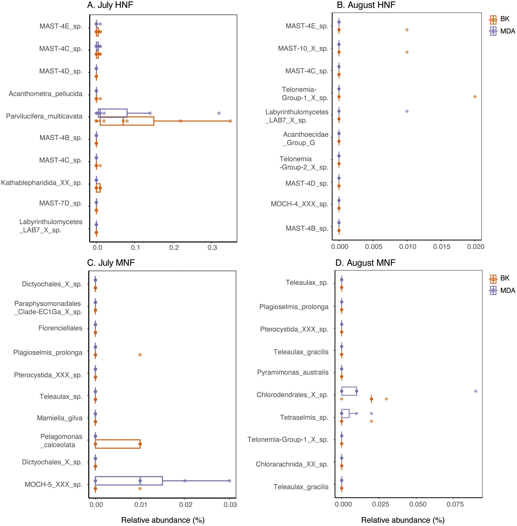 Box plots showing the relative abundance of different species across four panels: A) July HNF, B) August HNF, C) July MNF, D) August MNF. Each plot compares BK (orange) and MDA (purple) groups. Species listed on the y-axis, with relative abundance percentages on the x-axis. Data points and boxes indicate variation and central tendency.