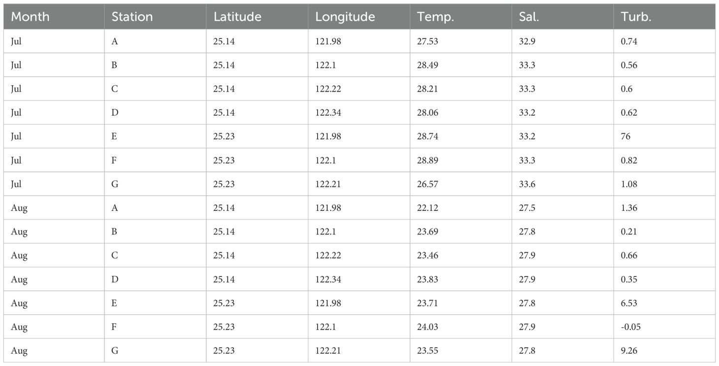 Table 1. Background information for the sampling stations includes longitude (°E), latitude (°N), temperature (Temp., °C), salinity (Sal., practical salinity unit, PSU), and turbidity (Turb., formazin turbidity unit, FTU), all measured using CTD probes.