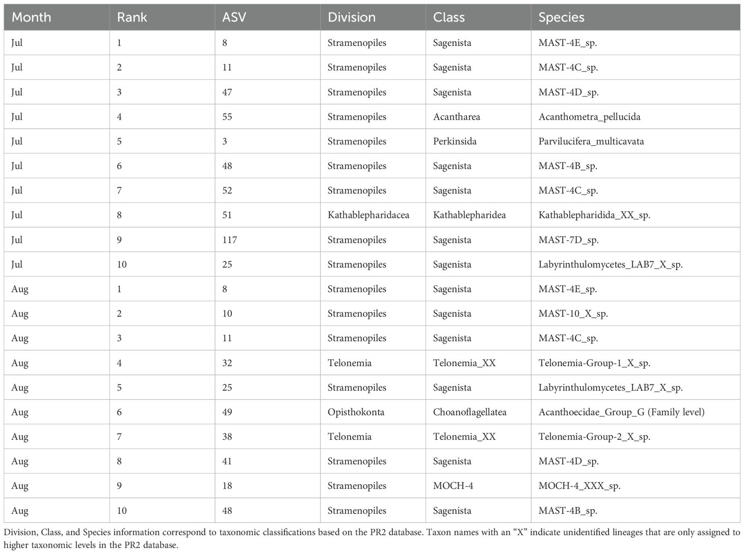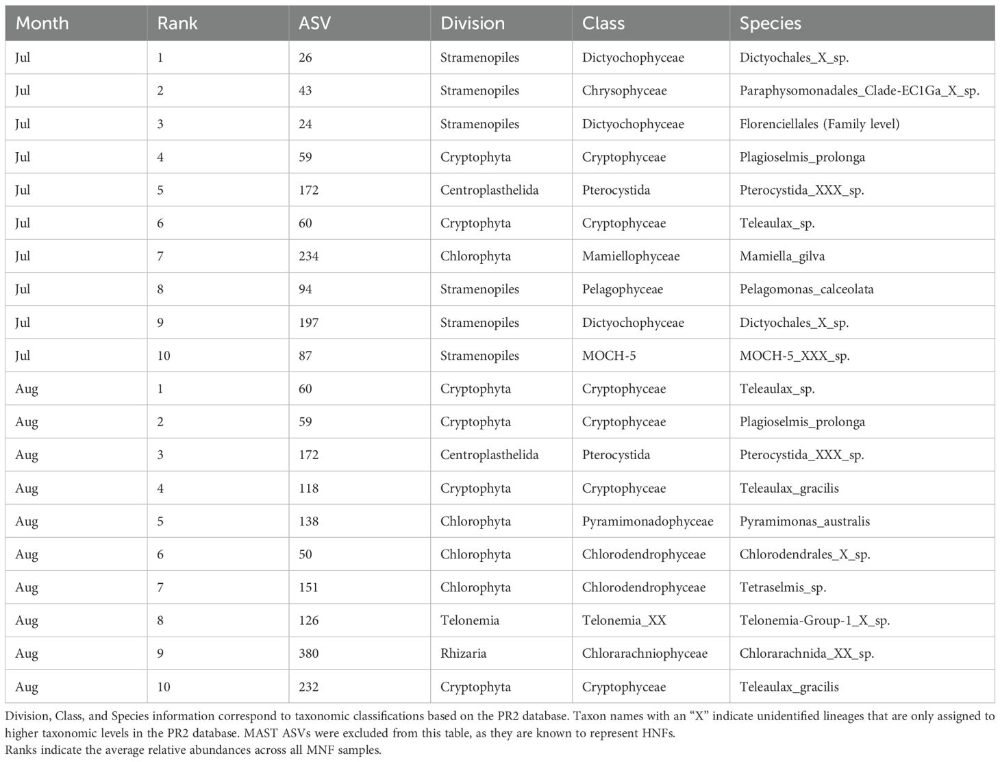Table 2. Top 10 most abundant HNF ASVs in July and August. Ranks indicate the average relative abundances across all HNF samples.