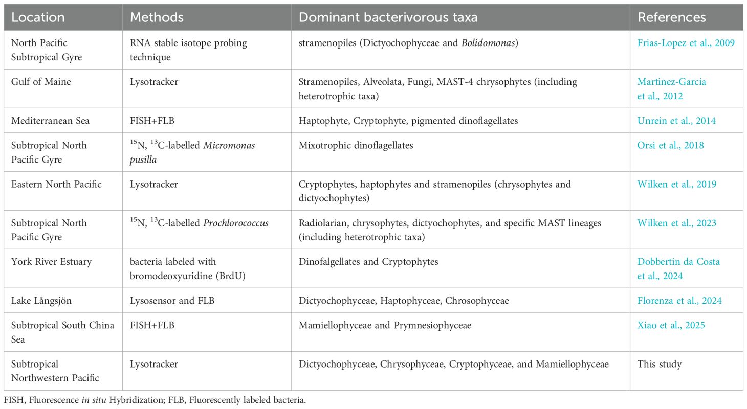 This study identified potential bacterivores among the dominant oceanic genera, such as Chloropicon, Mamiella, Mantoniella, Pycnococcus, as well as stramenopiles like Dictyochophyceae and Chrysophyceae. These taxa, classified as MNFs, may possess underestimated phagotrophic capabilities that require further confirmation through direct grazing observations, quantitative assessments of grazing rates, and the identification of phagotrophy-related genes. We also documented key HNFs within the MAST lineages, choanoflagellates (Opisthokonta), Telonemia, and Rhizaria, all of which are known to play important roles in bacterivory across marine systems. Our findings are consistent with previous observations of bacterivorous groups such as choanoflagellates, chrysophytes, and MAST clades reported by Wilken et al. (2023), using ¹³C and 15N-labelled Prochlorococcus (Table 4), emphasizing the widespread ecological relevance of these taxa. Laboratory studies have shown that rising surface seawater temperatures may reduce the photosynthetic performance of mixotrophs while enhancing their heterotrophic activity (Wilken et al., 2013; Pang et al., 2023). Therefore, identifying these bacterivores across both MNFs and HNFs provides important insights into their adaptive strategies and contributes to a more comprehensive understanding of carbon and energy flow within planktonic food webs. Overall, this study expands our knowledge of the diversity, trophic strategies, and ecological roles of microbial bacterivores in the subtropical northwestern Pacific and underscores their importance in biogeochemical cycling under changing ocean conditions.