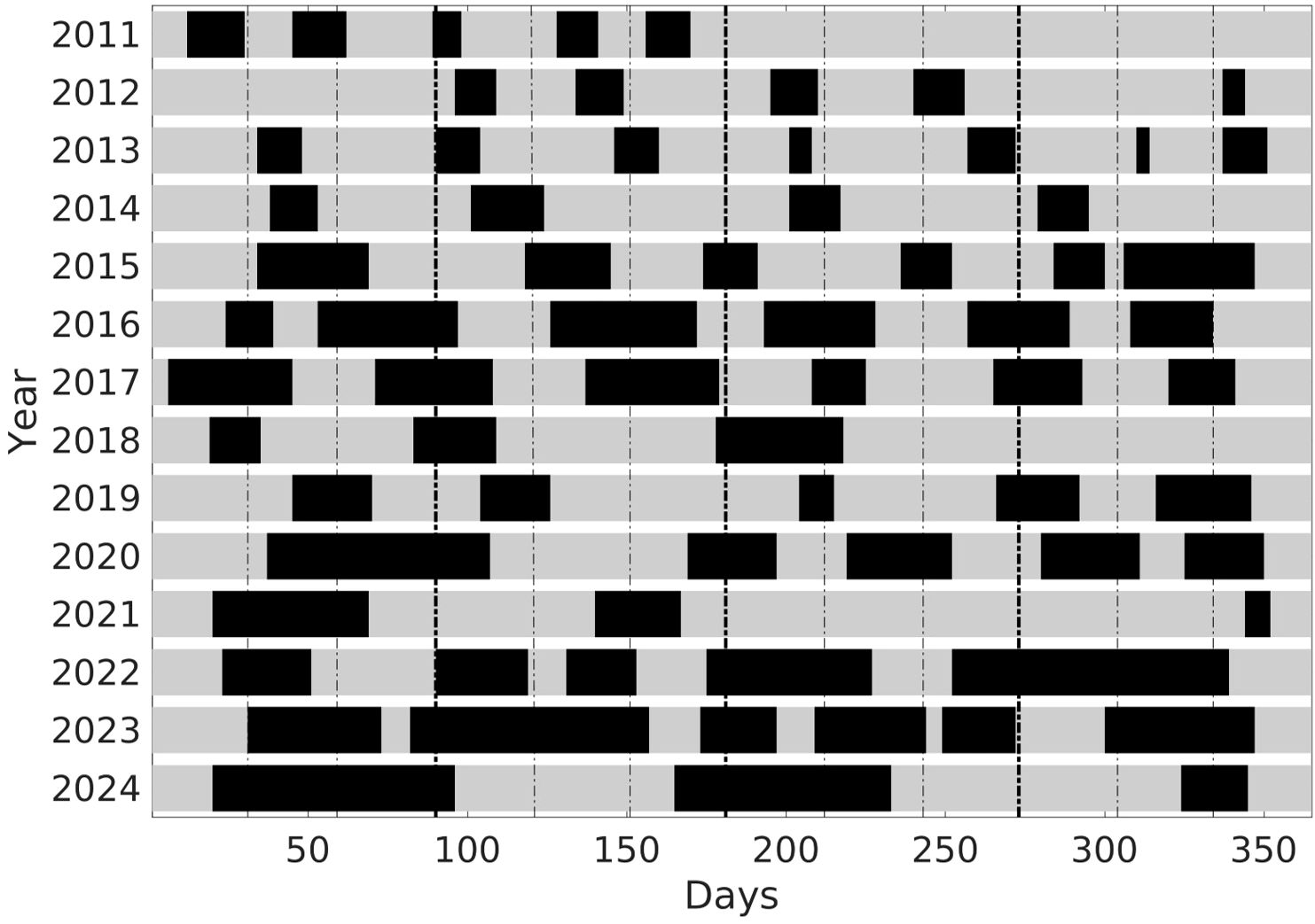 Finally, linear trends are estimated from a weekly timeseries of water mass properties over the period 2011–2024 with 95% confidence level according to the methodology from Chelton (1983).
