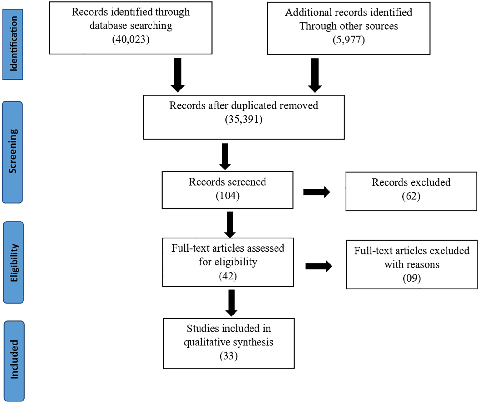 After reading and screening titles for relevance, we removed articles with focus on blue economy activities and policies that did not relate to Ghana. The remaining number of articles was 104. We then extracted information from articles for verification on whether an article was focused on a blue economy activity or a blue economy policy initiative in the Ghanaian context. After this, we checked the content of the articles to identify risks and challenges observed and discussed by the authors. We then proceeded by removing articles which did not conduct an assessment of the risks and challenges of the blue economy practices, activities and policies in Ghana. The remaining number of articles deemed eligible was 42 and we obtained the full-text article for quality assessment and review. The authors performed parallel independent assessments of the abstracts to reduce overall execution time and improve efficiency needed for the writing of the paper. We did a speed-read through the full-text articles to further evaluate the quality of the studies for inclusion. A total of 33 studies were included for the systematic review.