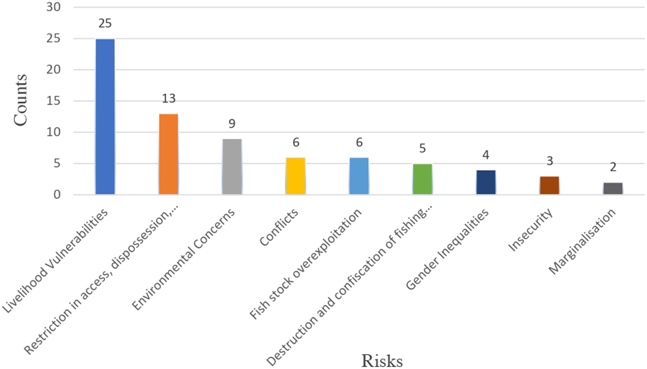 From Figure 3, while it remains visible that a risk may occur from more than one blue economy activity or policy, these risks and challenges may be broadly categorized as developmental, relational and environment-based. The risks include livelihood vulnerabilities (n = 26), restriction in access, dispossession and displacement of fishers and congestions of canoe bays (n = 13), environmental concerns (oil spillage, washing residues, seaweed, sea level rise (n = 9), conflicts (n = 6), overexploitation of fish stock (n = 6), destruction and confiscation of fishing gear (n = 5), gender inequalities (n = 5), insecurity (n = 3) and marginalisation (n = 2). In the subsequent subsections, we analyse the processes through which these risks and challenges occur.