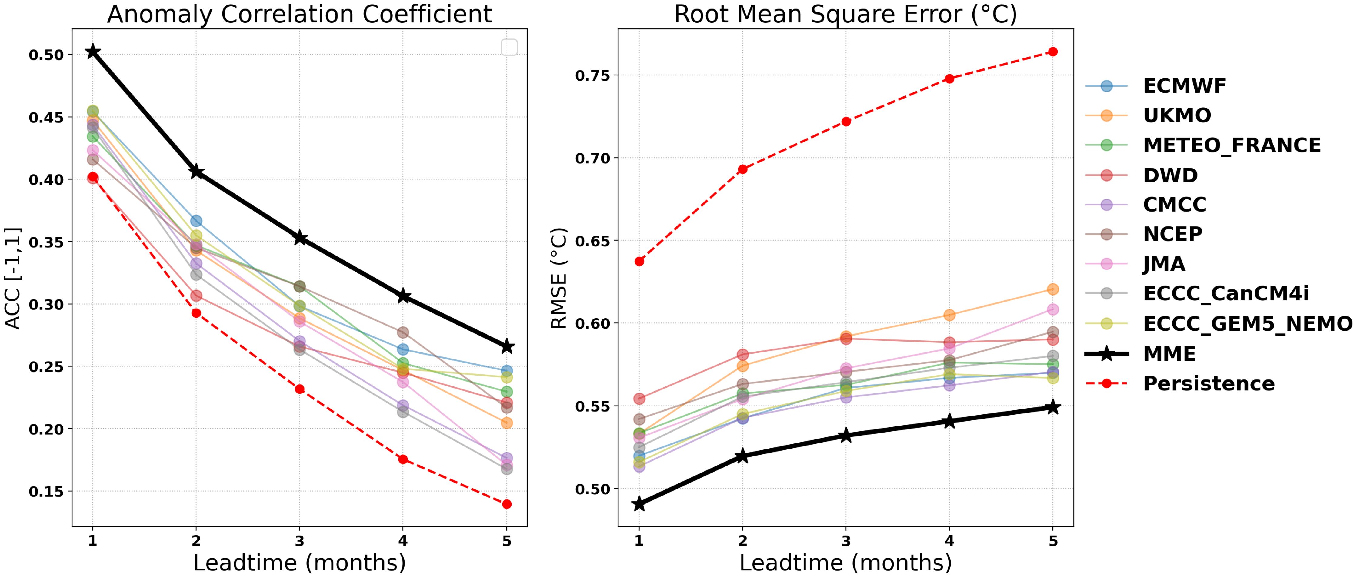 The deterministic forecasts are also evaluated against a persistence baseline. A persistence forecast uses observed SST anomaly of the previous month (1st to the ∼30th) which is ∼15 days earlier compared to the same time as the forecasts are available. In an operational setting, this is more realistic because the next ∼15 days future of observations are not available to compute the monthly mean SST. For instance, a February MME forecast initialised on January 1st is compared to a persistence forecast also generated on January 1st using December’s (1st to the ∼30th) mean anomaly. The persistence baseline used here assumes that SST anomalies remain constant from the previous month, a method commonly used in seasonal forecast benchmarking (e.g. Jacox et al., 2022).
