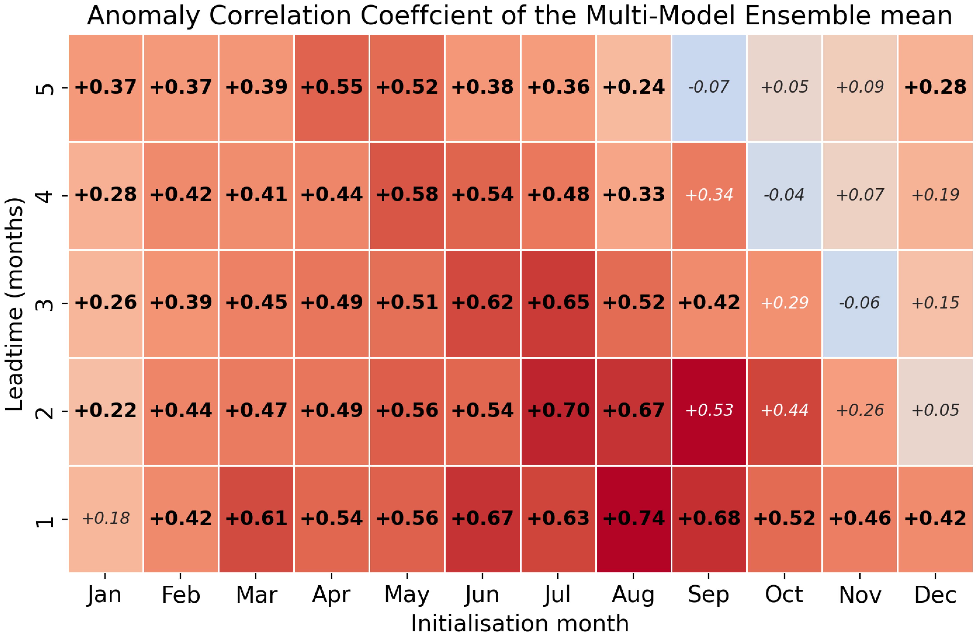 The decomposition of the ACC as a function of initialisation month shows that there is strong seasonality in forecasting skill (Figure 3). In general, the MME is more skillful than the persistence forecast across most months and lead times (bold numbers in Figure 3). The ACC of the MME mean tends to be greatest for forecast initialized between June to September, when ACCs are greater than 0.6 for lead time of one month and greater than 0.4 for lead times between one and three months. From October to December, the MME mean skill decreases for lead times greater than one month and is outperformed by a persistence forecast. February SST anomalies are the hardest to predict. Forecasts initialised in September (5-month lead time) and January (1-month lead time) have the lowest ACCs for the period analysed. This lower ACC for February also occurs for forecasts initialised between October and December. Forecast skill, however, with lead time longer than a month, starts to improve again from January onwards, when the ACC exceeds 0.4 in February.