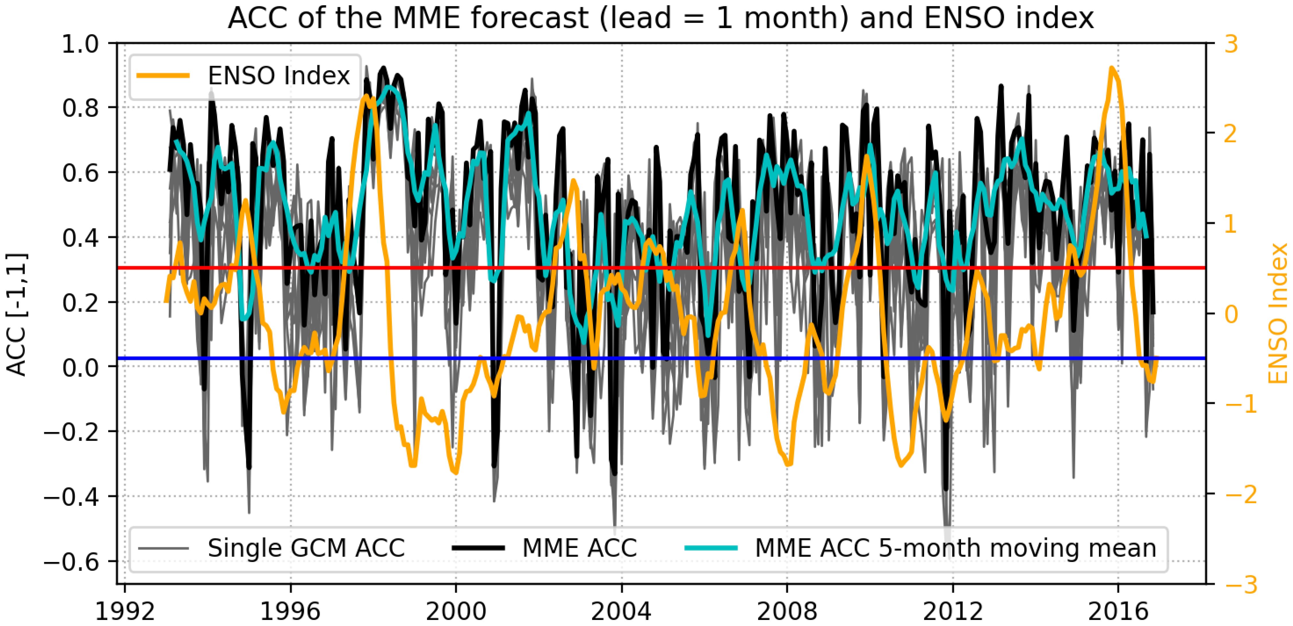 Figure 4. Time series of monthly anomaly correlation coefficient (ACC; left axis, black and grey lines) at one-month lead time from the multi-model ensemble (MME; black) and individual GCMs (grey lines), along with a five-month moving average of MME ACC (cyan line). The orange line shows the monthly ENSO index (Niño 3.4 region, right axis), with red and blue horizontal lines indicating the ±0.5 thresholds for El Niño and La Niña events, respectively.