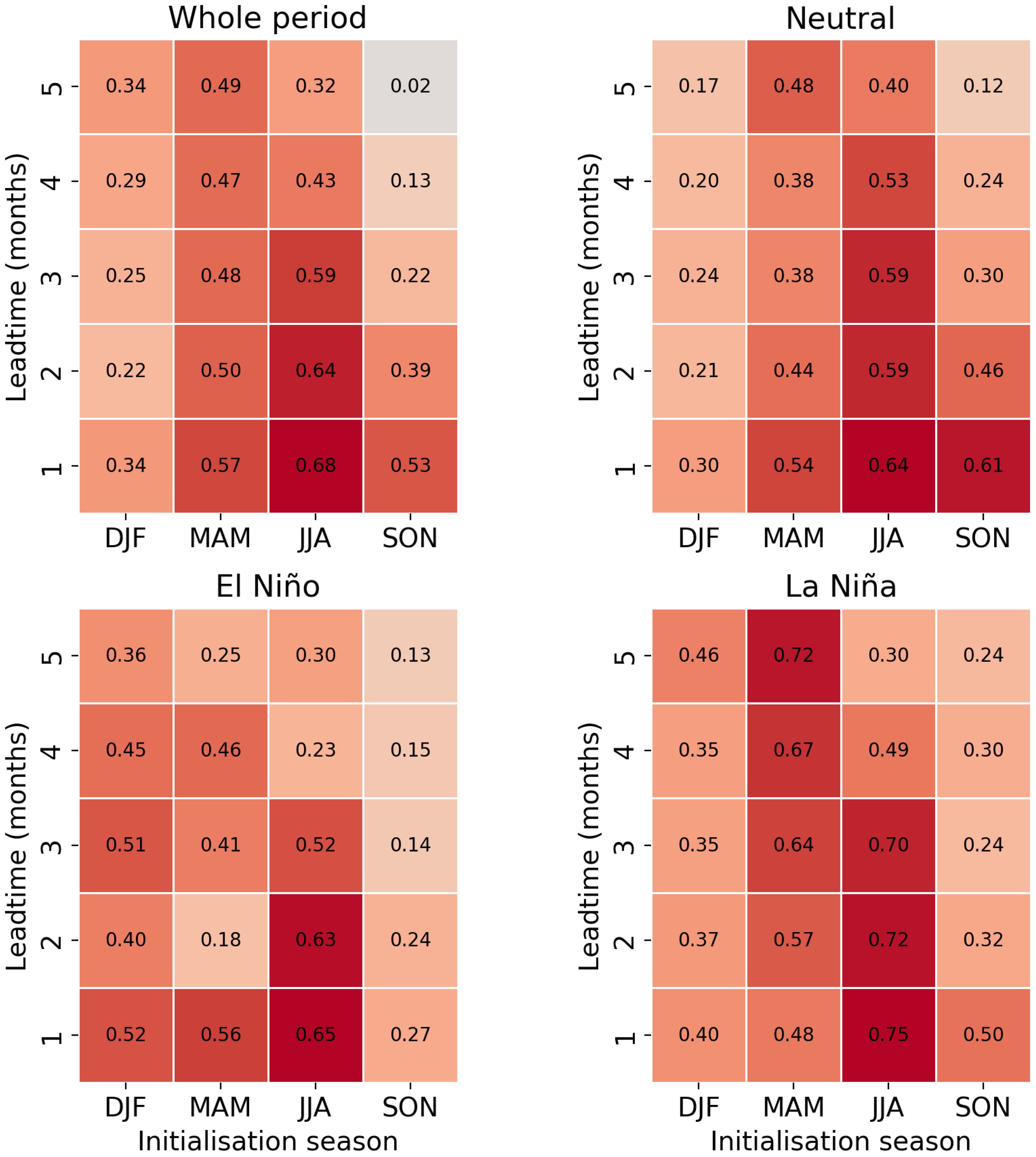 When skill is stratified by ENSO phase, distinct patterns emerge. During El Niño conditions, ACC values are enhanced for forecasts initialized in austral summer (DJF), when the ACC reaches values above 0.5 at 1- and 3-month lead times. In contrast, during La Niña conditions, the forecast skill (ACC values) tend to be larger during the austral winter (JJA). The ACC reaches the largest values (0.75) with one-month lead time and 0.70 with three-month lead time in JJA. This reflects a robust influence of La Niña in driving more predictable SST anomalies from winter towards spring. During neutral ENSO conditions, forecast skill is generally diminished in summer and winter but it has the highest ACC values in spring (SON) from one- to three-months lead time.