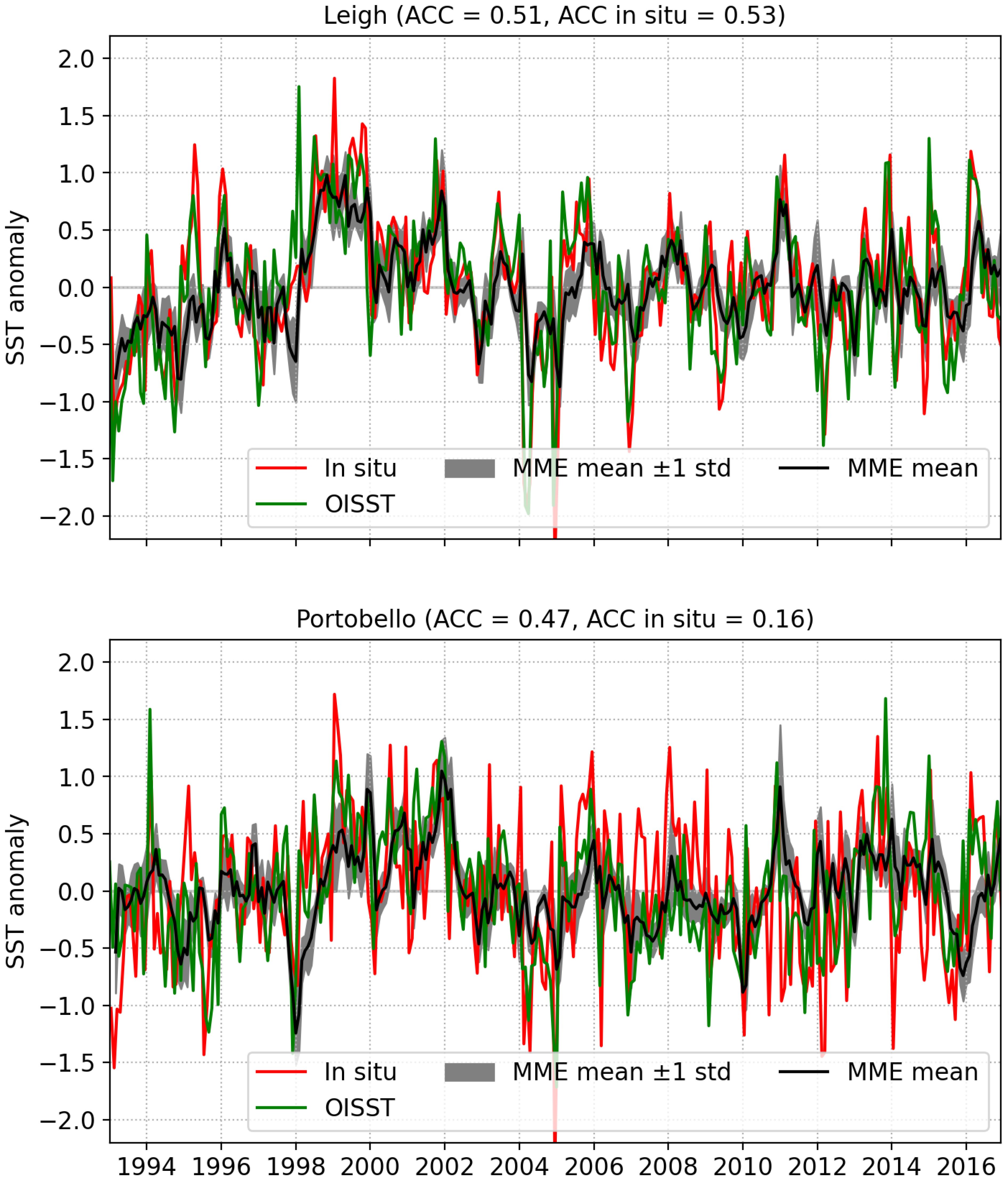 The comparison between satellite-derived SST (OISST) and long-term in situ records provides an important baseline for evaluating the reliability of the MME forecasts at coastal sites. The correlation coefficient between OISST and in situ data from 1993 to 2016 was 0.89 at Leigh and 0.63 at Portobello, values that are consistent with those reported previously by Shears and Bowen (2017) (0.81 and 0.69, respectively). Building on this baseline, we next assess how well the MME forecasts capture SST anomalies compared directly with in situ records.
