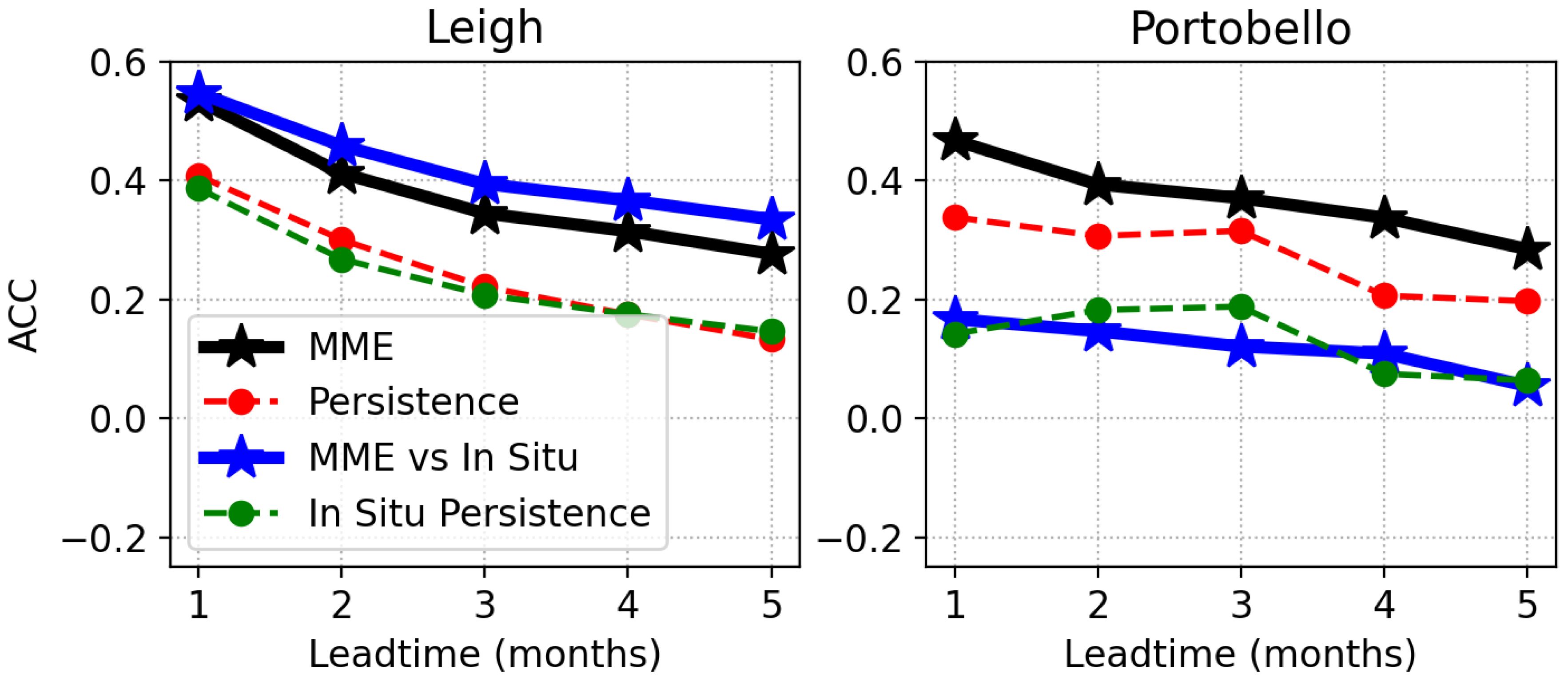 Figure 7. Anomaly correlation coefficient (ACC) comparing the multi-model ensemble (MME, solid lines) and persistence forecasts (dashed lines) against/from OISST (black and red) or in situ data (blue and green). ACC is shown across different lead times (1–5 months) for Leigh and Portobello coastal stations.
