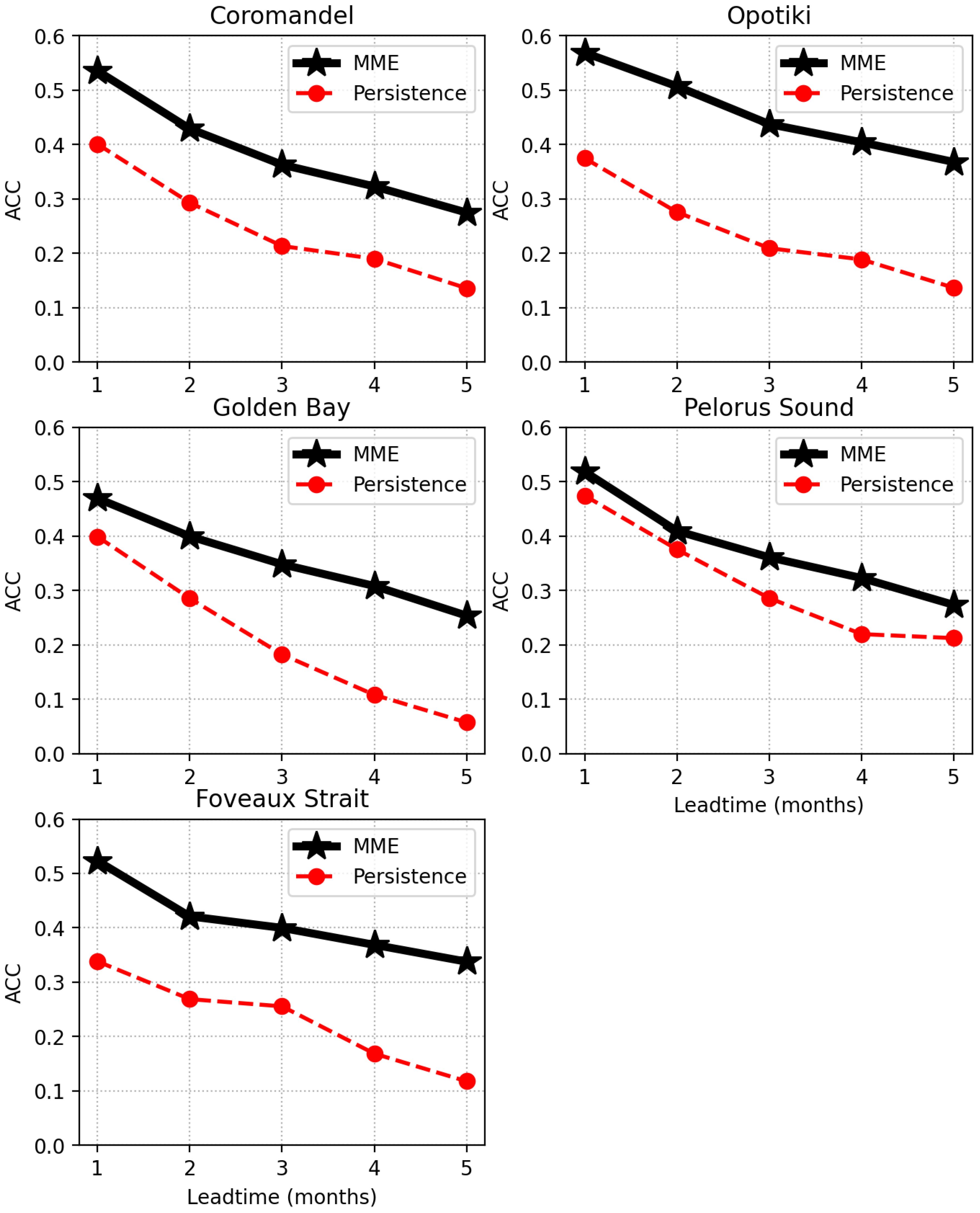 Figure 9. Anomaly correlation coefficient (ACC) comparing the multi-model ensemble (MME, black solid lines) and persistence forecasts (red dashed lines) across different lead times (1–5 months) for key aquaculture regions around Aotearoa New Zealand.