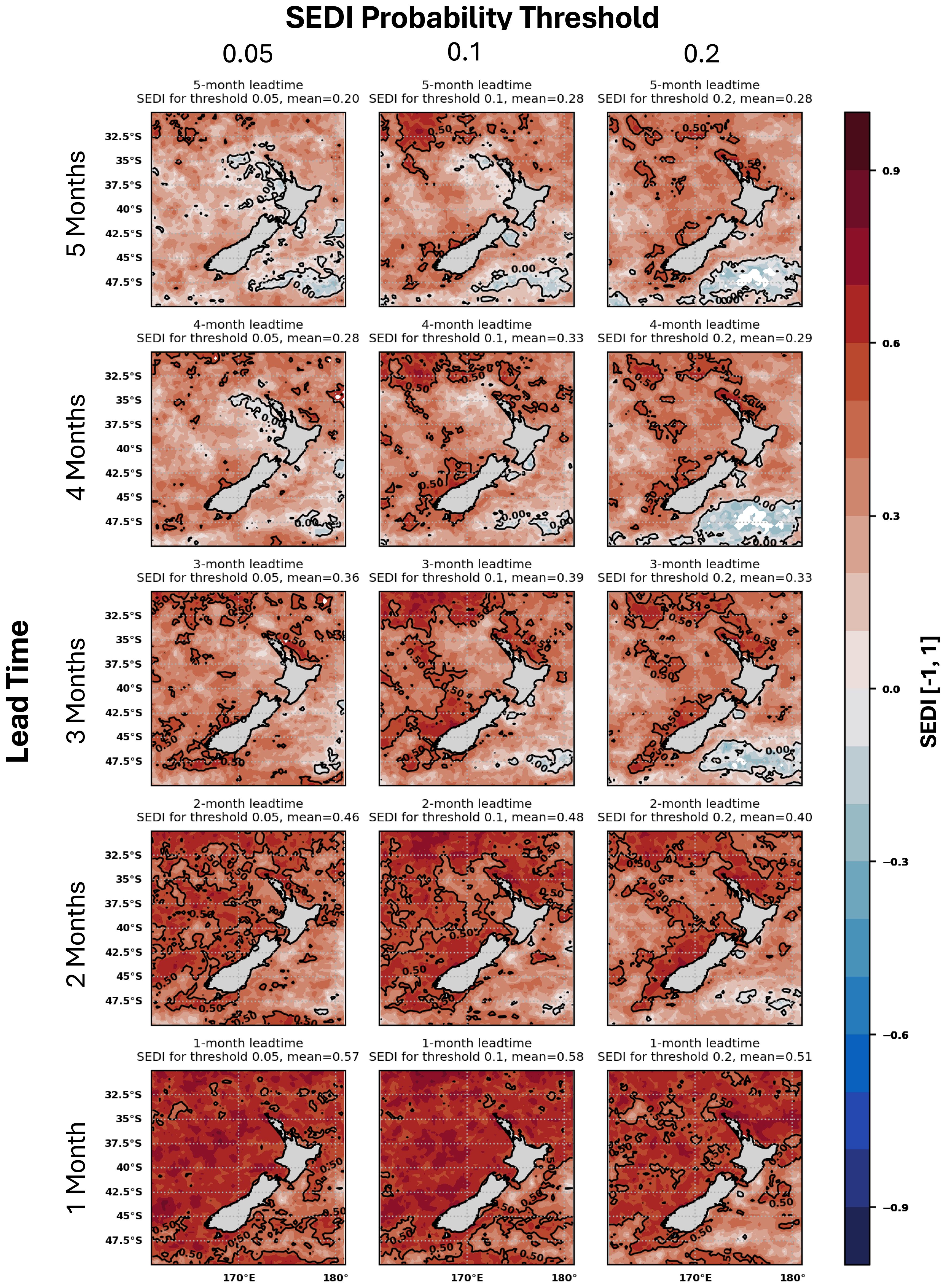 Figure 11. Symmetric External Dependency Index (SEDI) of the marine heatwave (MHW) forecast using probabilistic thresholds of 0.05 (or 5%, left column), 0.1 (or 10%, centre column), and 0.2 (or 20%, right column) to determine occurrence of MHWs. Lead time grows from the bottom row (1 month) to the top row (5-month lead time).