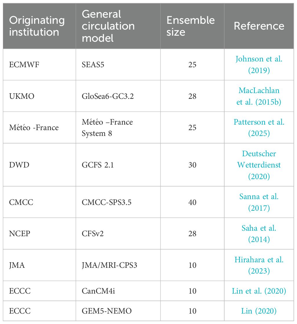 The monthly hindcast outputs are sourced from the Copernicus Climate Data Store (CDS), established under the auspices of the Copernicus Climate Change Service (C3S). The CDS collects hindcast and forecast data generated by nine international institutions, namely the European Centre for Medium-Range Weather Forecasts (ECMWF), the United Kingdom Meteorological Office (UKMO, UK), Météo-France (the French Meteorological agency), The Deutscher Wetterdienst (DWD, Germany), the Centro Euro-Mediterraneo sui Cambiamenti Climatici (CMCC, Italy), the National Centers for Environmental Prediction (NCEP, USA), the Japan Meteorological Agency (JMA, Japan), and Environment and Climate Change Canada (ECCC) which has two GCMs: ECCC-CanCM4i and ECCC-GEM5-NEMO. Together, these GCMs constitute the multi-model ensemble (MME). The period covering from 1993 to 2016 is considered standard by C3S and it is used in several studies (e.g. Lledó et al., 2020; Thornton et al., 2023).