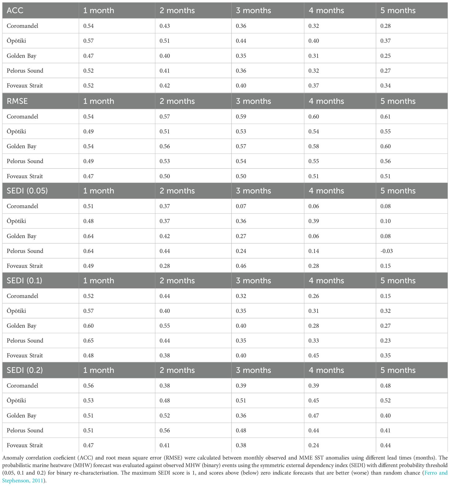 Table 2 summarises the results across the five aquaculture regions. Deterministic metrics (ACC and RMSE) confirm that MME SST anomaly forecasts are most skillful at short lead times (1–2 months). For instance, Ōpōtiki consistently achieve the highest ACC values at 1-month lead time (0.57), while also maintaining relatively low RMSE values, indicating both high correlation and reduced magnitude of errors. Golden Bay and Coromandel exhibit slightly higher RMSE/lower skill overall, possibly reflecting the influence of localised coastal processes not fully resolved at the model’s 0.25° spatial resolution. Pelorus Sound and Foveaux Strait showed intermediate skill probably due their location in straits with increased mixing and less surface heat flux influence. Forecast skill declines progressively with lead time across all regions, with ACC values dropping below 0.38 and RMSE exceeding 0.50 by month 5, highlighting the challenge of accurate seasonal prediction at longer horizons.