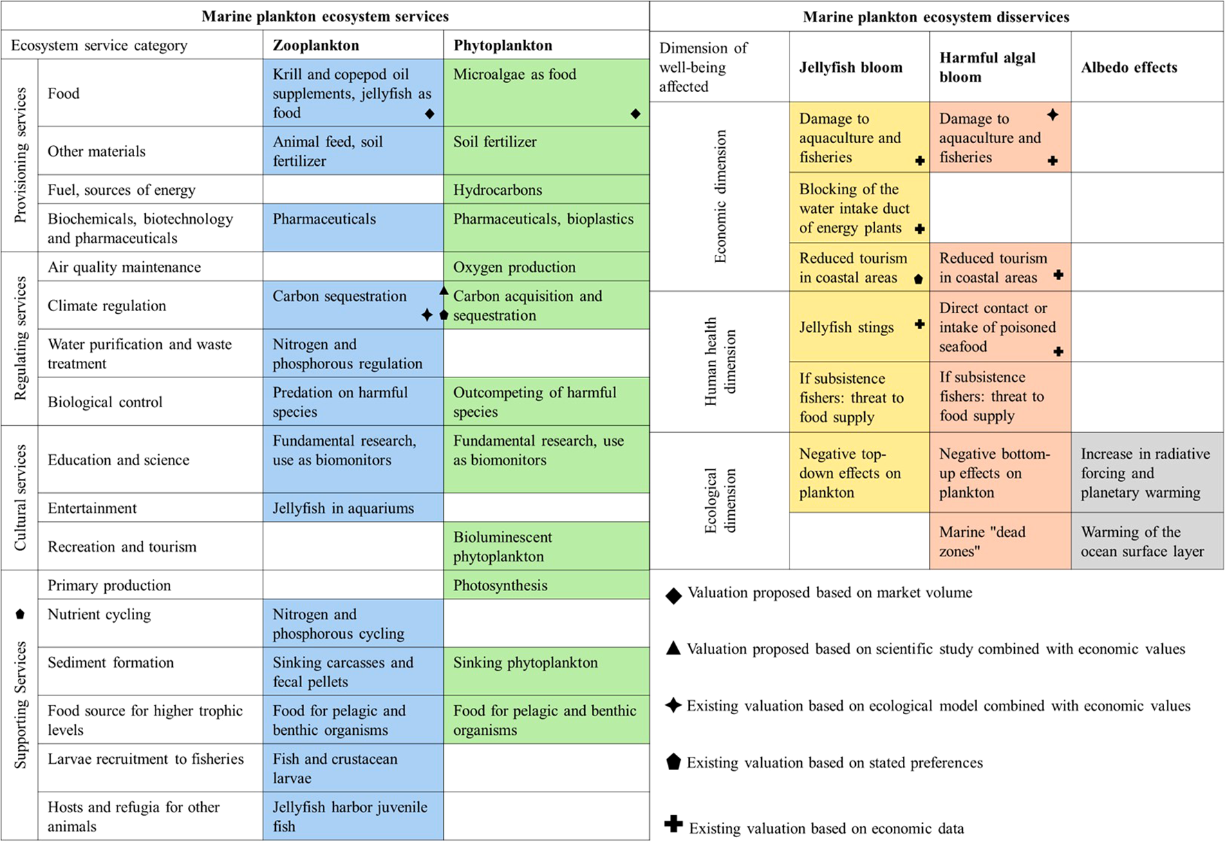 Plankton ES and EDS identified in the literature. Symbols indicate those for which valuation studies have been conducted (existing valuation) and for which proxies are proposed in this article (valuation proposed).