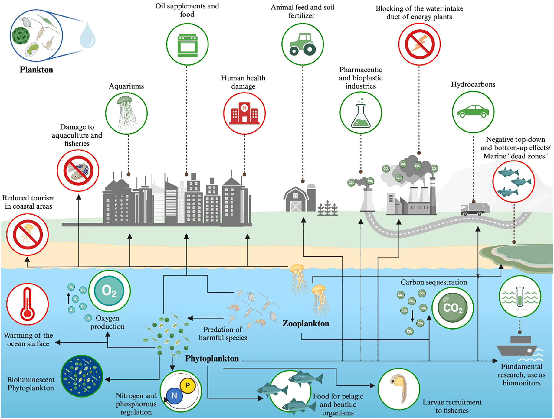 Ecosystems create the necessary conditions for life on earth and provide a large number of benefits to humans, which for several decades have been conceptualized as Ecosystem Services (ES) to highlight their economic importance (Costanza and Daly, 1992; Costanza et al., 1997). On the other hand, some ecosystem activities have negative impacts on human wellbeing, and have therefore been referred to as Ecosystem Disservices (EDS) (Shackleton et al., 2016). Marine plankton, the innumerable organisms drifting in the ocean - including plants, animals, bacteria, viruses and fungi - are associated with both ecosystem services and disservices. These life forms play a crucial role in supporting marine food webs, regulating global carbon cycles, climate, and producing oxygen. However, they can also cause ecological disruptions, such as harmful algal blooms that deplete oxygen levels and release toxins, negatively impacting marine life and human activities.