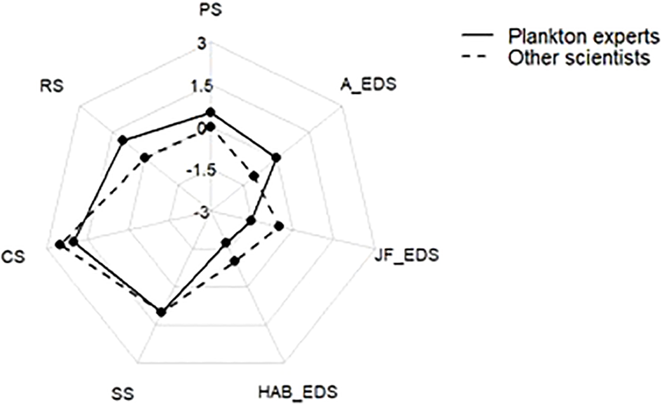 We distinguish between two groups of experts, based on their own declarations: those that are explicitly plankton experts because a significant part of their work deals with plankton, and other marine scientists. Additionally, we asked the respondents for details about their scientific background. The expertise of the self-identified plankton experts spanned the following domains: plankton ecology, including phytoplankton and zooplankton dynamics, HABs, and marine eukaryotic biodiversity; genomic approaches, including metagenomics and environmental genomics, with bioinformatics applied to the study of cyanobacteria, picophytoplankton, and microalgae; biogeography and system-level analysis, encompassing phytoplankton and fish; and numerical modeling, focused on simulating plankton dynamics. The areas of expertise of the other marine scientists were closely related, included marine biology and microbial ecology, with a focus on marine microorganisms, diatom-bacteria interactions, and microbial diversity in deep-sea sediments; environmental chemistry, particularly in relation to organic matter dynamics; ecosystem and food web modeling, with applications to plankton diversity and phytoplankton biogeochemical roles.