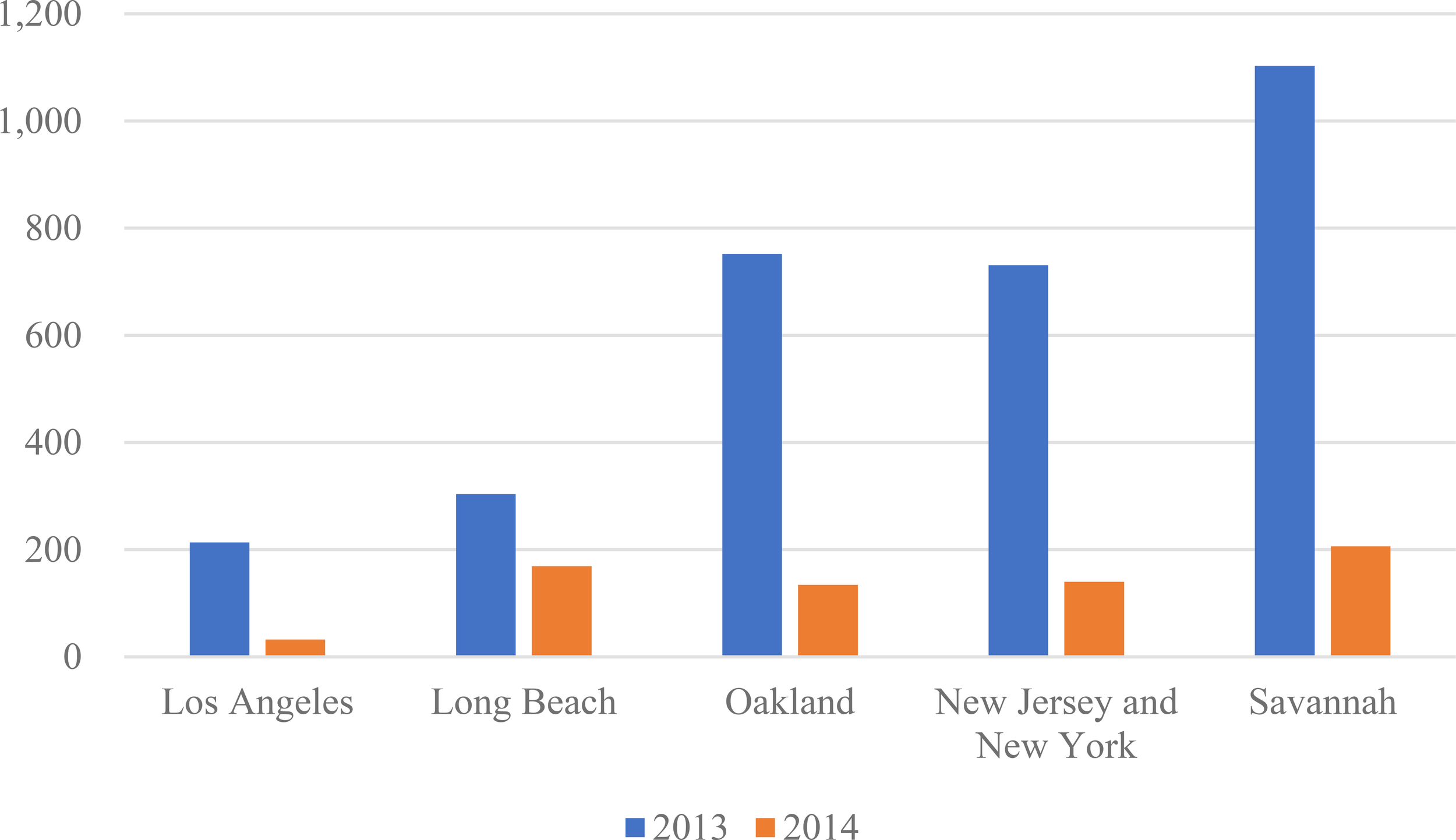 We calculated the SO2 emissions of five ports in the United States in 2013 and 2014, and the results are shown in the Figure 3. It can be seen that compared to 2013, the SO2 emissions from these five ports have significantly decreased in 2014.