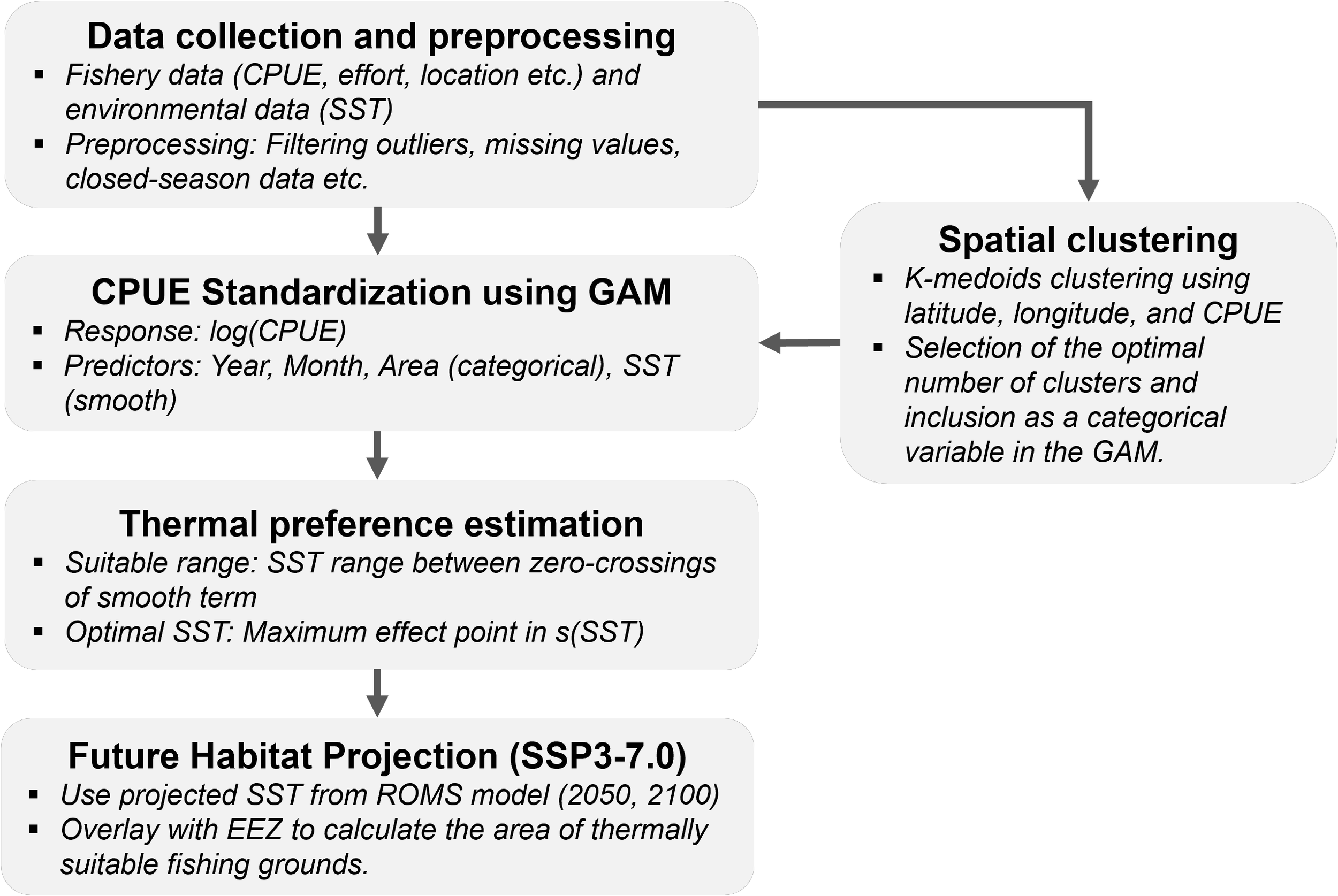The overall analytical process in this study consists of five sequential stages: (1) data collection and preprocessing, (2) spatial clustering, (3) CPUE standardization using GAM, (4) thermal preference estimation, and (5) future habitat projection under the SSP3-7.0 climate scenario. These components are detailed in the following subsections (Figure 1).