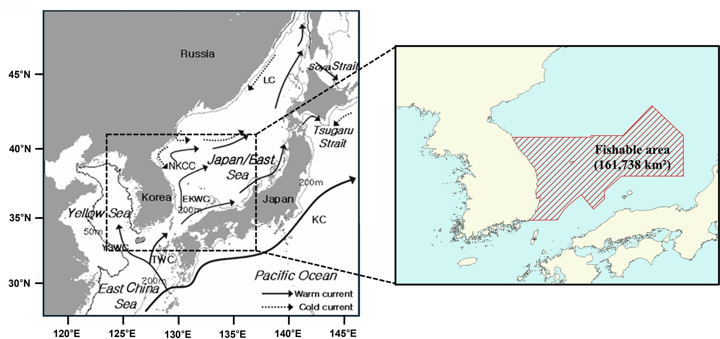 Geography and current system around the Korean Peninsula (left; modified from McFarlane et al. (2009)) and the fishable area in the eastern Korean exclusive economic zone (EEZ) designated as the analysis domain in this study (right).