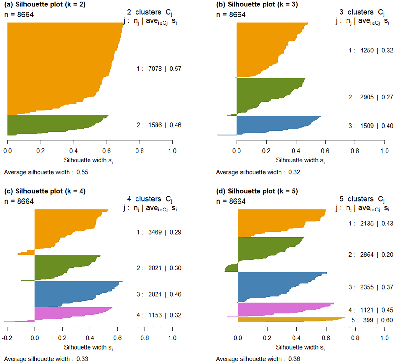 To determine the optimal number of spatial clusters, the silhouette score was calculated, which evaluates both within-cluster cohesion and between-cluster separation (Rousseeuw, 1987). Clustering analyses were conducted for k values ranging from 2 to 5, and the silhouette score was computed for each configuration to identify the one with the highest score. The silhouette score ranges from –1 to 1, with higher values indicating better-defined and more cohesive clustering.