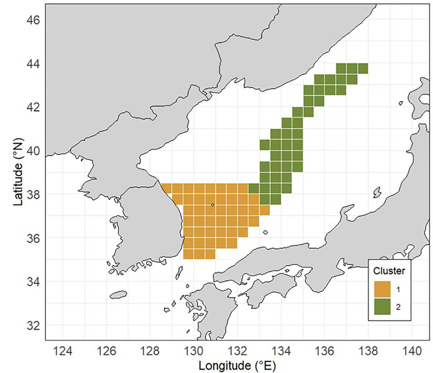 Based on the spatial analysis conducted in this study, the study area was divided into two distinct subareas. When fishing locations are non-randomly selected, CPUE data collected from preferred fishing grounds may exert a disproportionate influence on the estimation of fish abundance (Conn et al., 2017; Hsu et al., 2022). To address this issue, a spatial clustering approach based on the k-medoids algorithm, as proposed by (Ono et al., 2015), was applied. The resulting stratified areas were used as a categorical explanatory variable in the CPUE standardization model. For the clustering process, latitude, longitude, and CPUE data of T. pacificus were used as input variables. The k-medoids algorithm assigns cluster centers as medoids—actual data points that minimize the average dissimilarity within each cluster. Euclidean distance was used to measure spatial dissimilarity between grids, and the center of each cluster was defined as the data point with the smallest average dissimilarity to all others in the same cluster.
