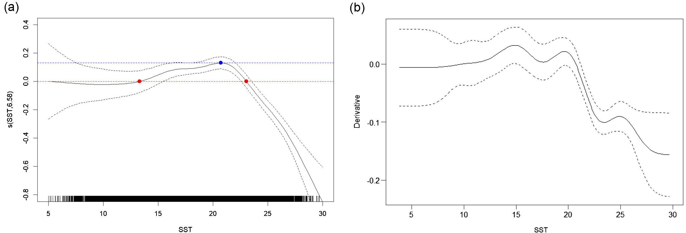 (a) Estimated smooth effect of sea surface temperature (SST) on the standardized catch per unit effort (CPUE) of the common squid using a generalized additive model (GAM). The solid black line represents the fitted smooth function with 95% confidence intervals (dashed lines). The red points indicate the SST values (13 °C and 23 °C) where the smooth effect crosses zero. The blue point indicates the SST (21 °C) at which the smooth effect reaches its maximum. (b) First derivative of the smooth SST effect, showing the rate of change in s(SST). The solid line represents the estimated derivative, and the dashed lines show the 95% confidence interval.