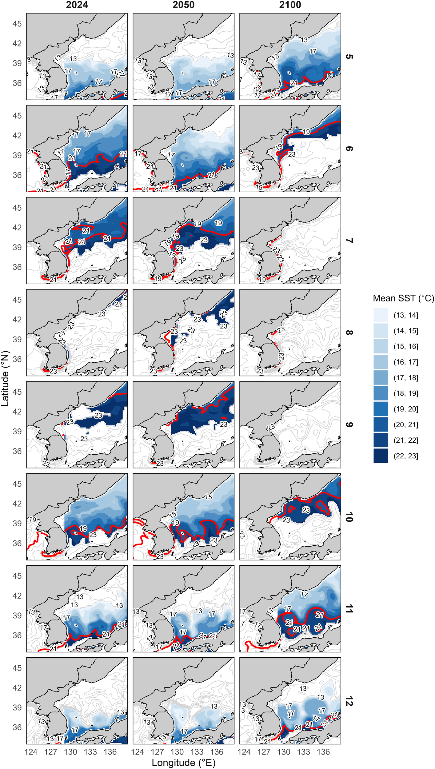 Projected monthly mean SST distributions from May to December in 2024, 2050, and 2100 under the SSP3-7.0 scenario. The suitable thermal range of the common squid Todarodes pacificus, 13–23 °C, is highlighted to identify potential fishing grounds. Black contour lines indicate SST intervals, and colored shading represents the SST range. The red contour line indicates the optimal temperature of 21 °C. Spatial patterns indicate a northward shift of thermally suitable habitats during May and June, and a notable reduction in suitable areas in the eastern part of the Korean EEZ during September and October—the peak fishing season—by 2100. Suitable conditions reappear in the south from November onward.