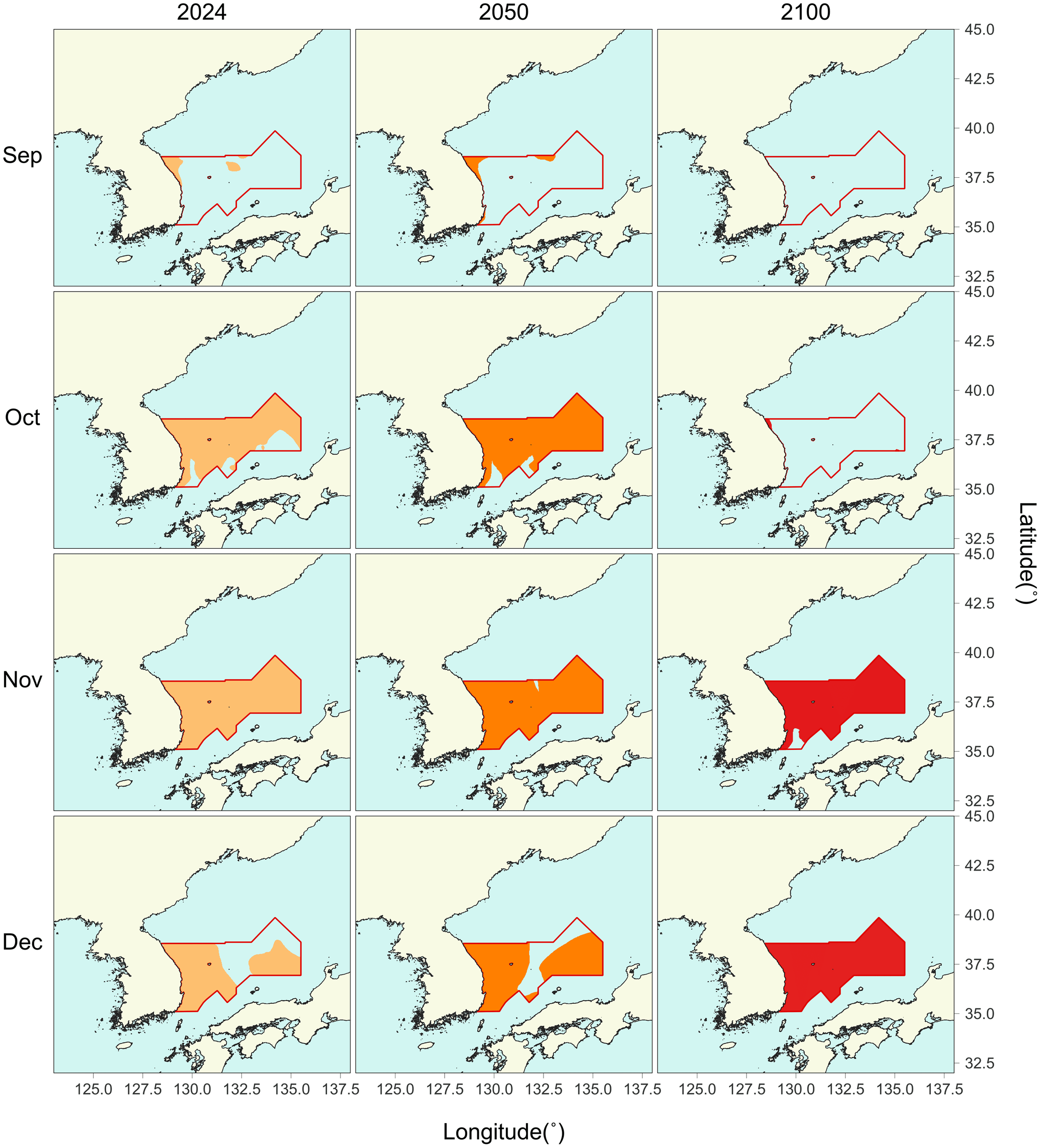 The spatiotemporal analysis indicated a gradual northward shift in the thermally suitable habitat range (13–23 °C) of common squid over time. In particular, the 21 °C isotherm—historically observed along Korea’s southern coast in May and June—was projected to move progressively toward the northern part of the eastern waters of Korea and Russian waters. Conversely, during September and October, traditional fishing grounds along the southern part of the eastern waters of Korea were projected to experience elevated temperatures exceeding 23 °C. Under the 2100 scenario, thermally suitable habitats in southern waters disappeared entirely during this period and reappeared in November and December.