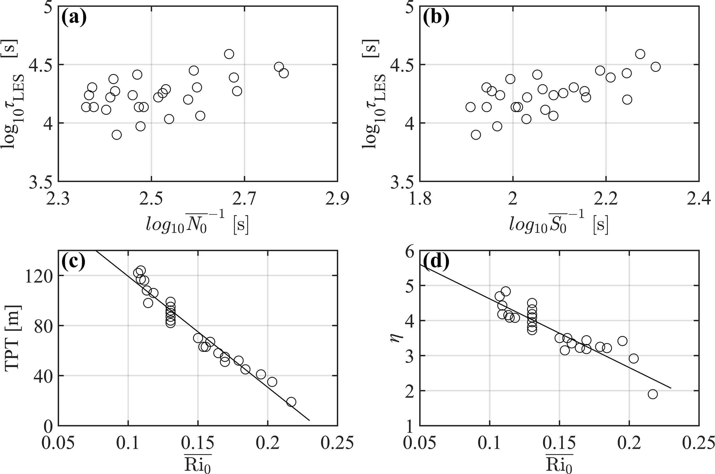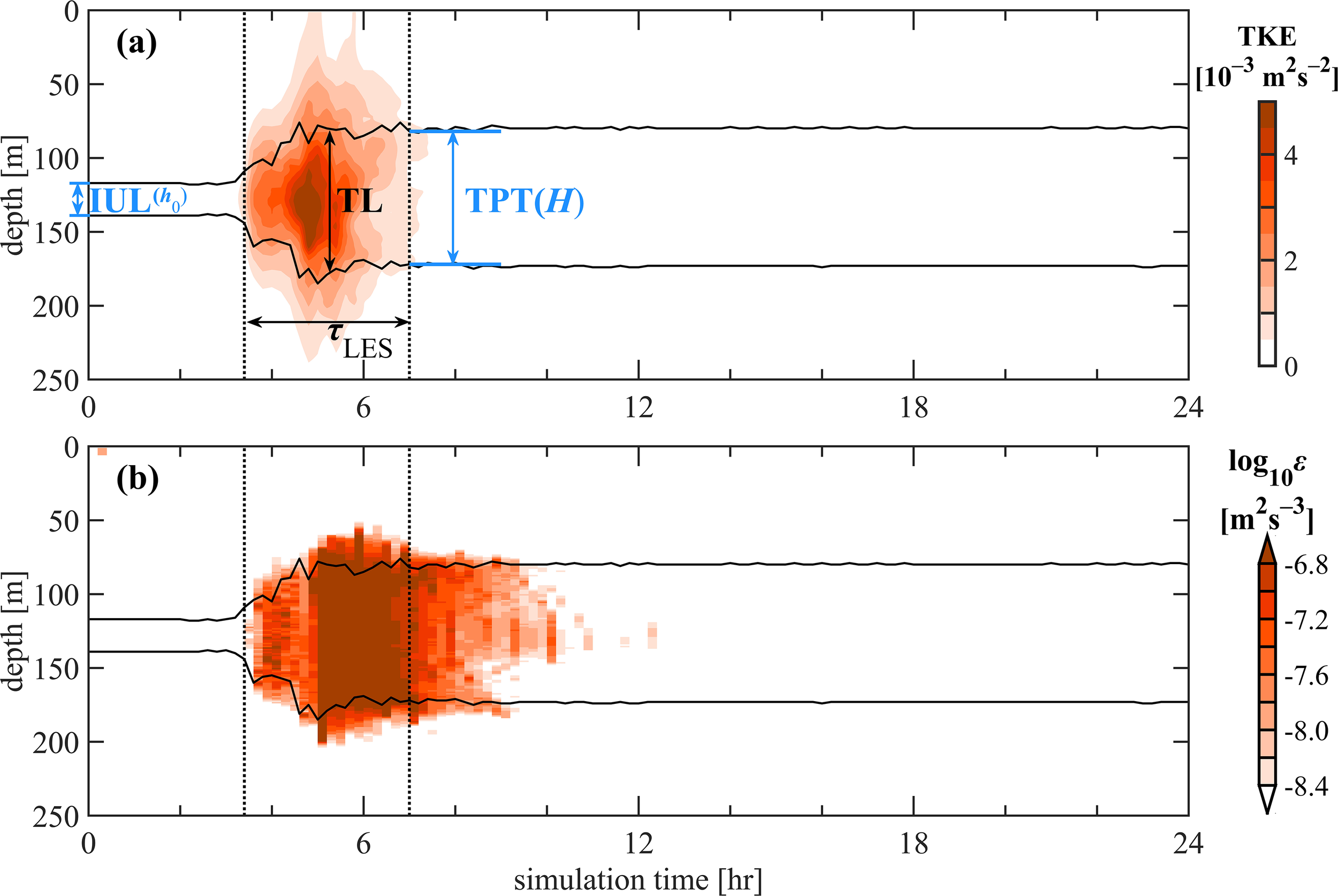 The 3D (horizontally over the domain and vertically over the TL) and temporally (over the turbulent stage) averaged TKE dissipation rate , turbulent diffusivity and buoyancy frequency can be directly calculated from the LES outputs by