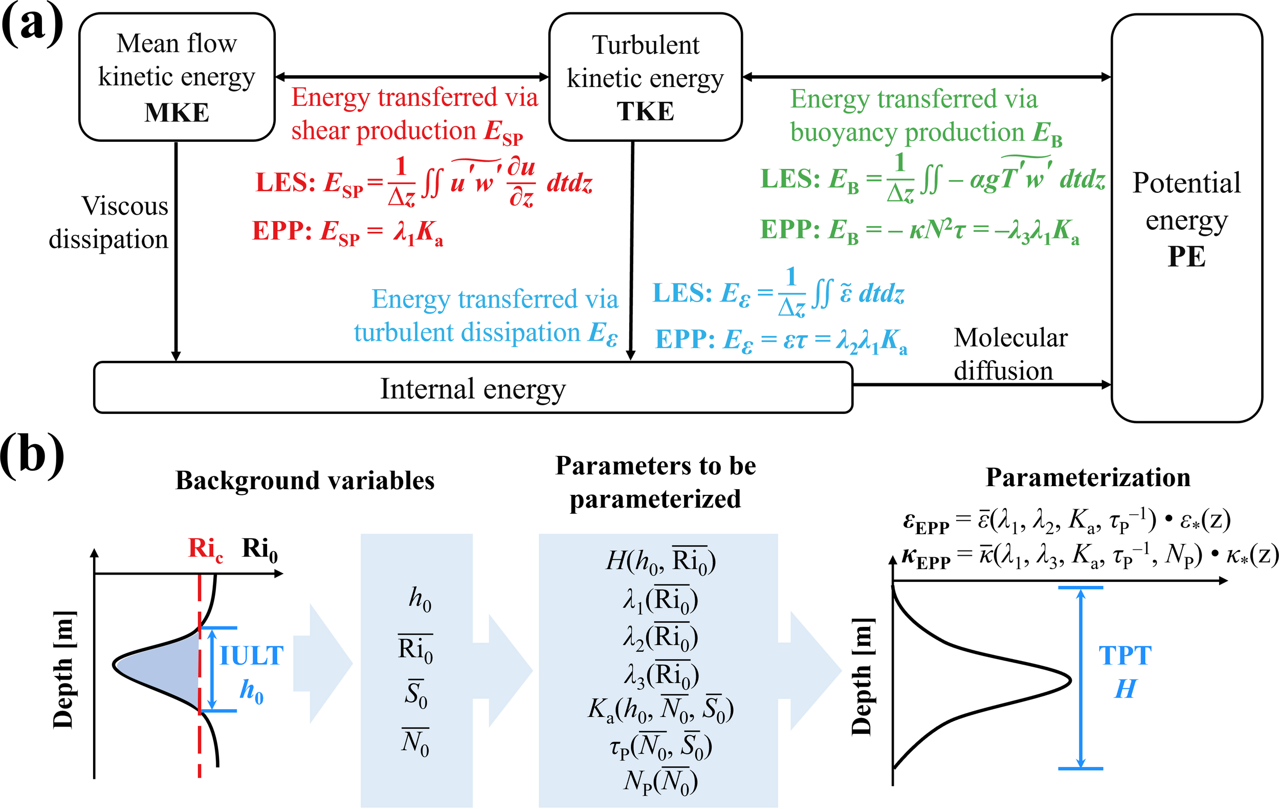 (a) Schematic representation of the energy transformation. Boxes represent energy reservoirs. Arrows are transfers (reversible or irreversible) between reservoirs. The transferred/transformed energy via shear production (red), turbulent dissipation (blue) and buoyancy production (green) calculated from the LES outputs and parameterized by EPP are described by (Equations 4-9). (b) Schematic of parameterization described by (Equations 10-15).