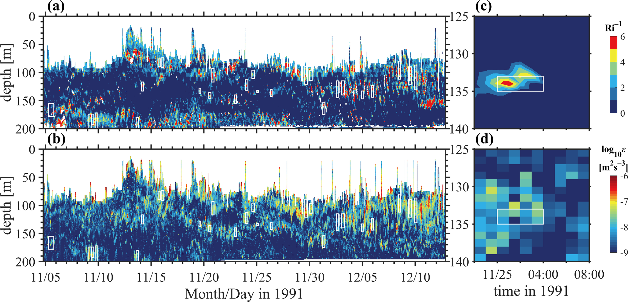 Depth-time plots of (a) inverse Richardson number and (b)ϵ of TIWE. (c, d) as in (a, b) but for the turbulent events described in section 2.6. Times are UTC. White boxes represent the turbulent events. Values are blanked (white) in the ML and deep cycle layer in (a, b). The depth of ML is defined as the minimum depth within which the density is 0.01 kg m−3 heavier than the surface value while the DCL base is defined as the deepest depth below the ML at which Ri< 0.25 (Lien et al., 1995).