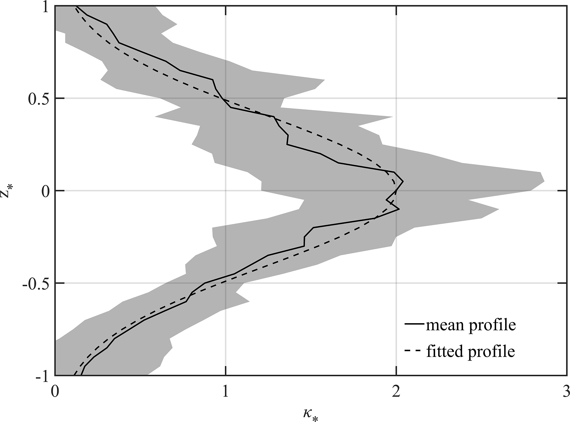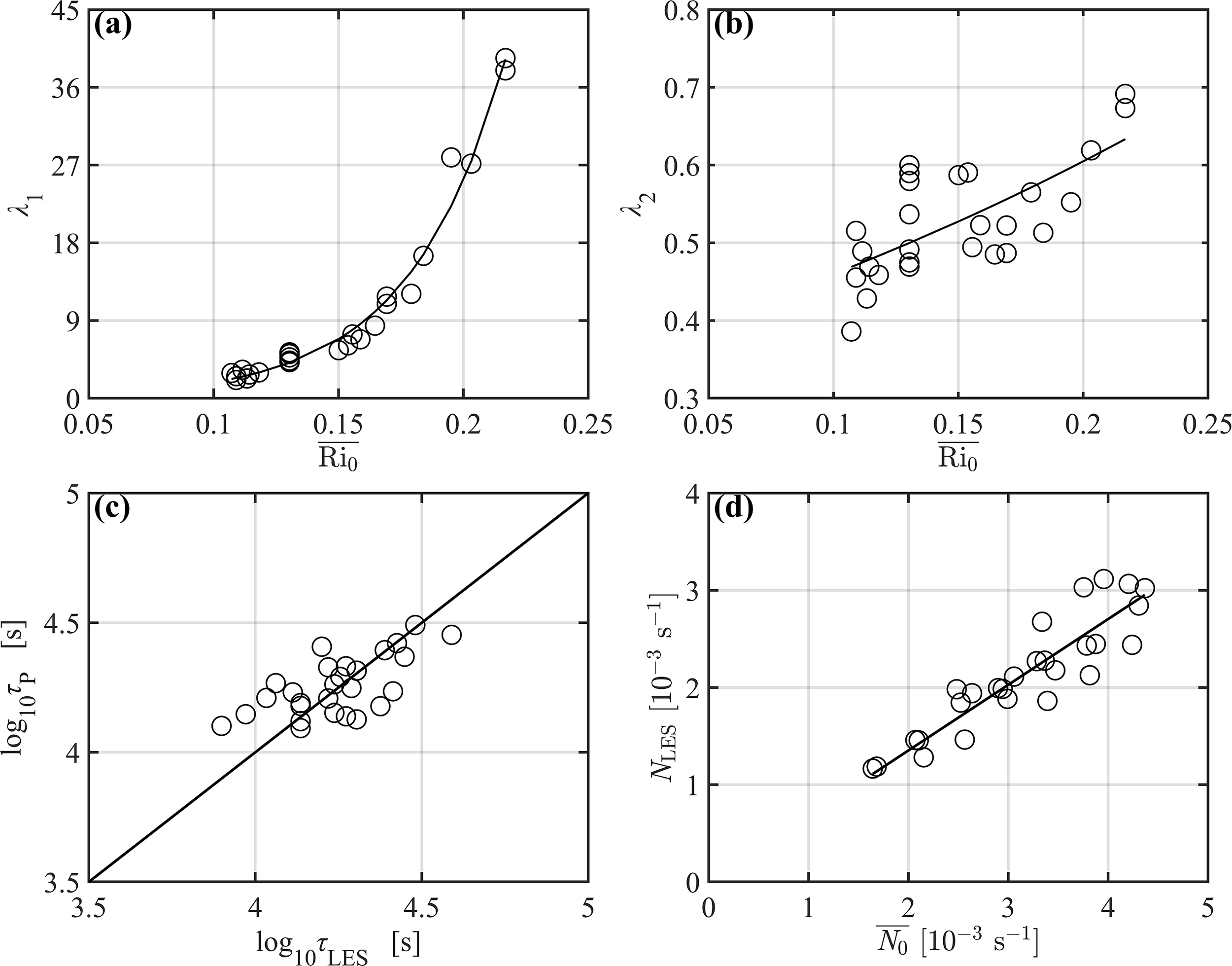 In sum, for each experiment, is calculated by initial variables, while the energy transferred via shear production () is calculated from LES outputs. By equating the parameterized to the (Equation 8), is derived for each experiment. Through regression analysis, is parameterized as a function of . Similarly, parameterizations for , , and are obtained. Ultimately, parameterized expressions for the turbulent diffusivity and dissipation rate are derived (Figure 3b).