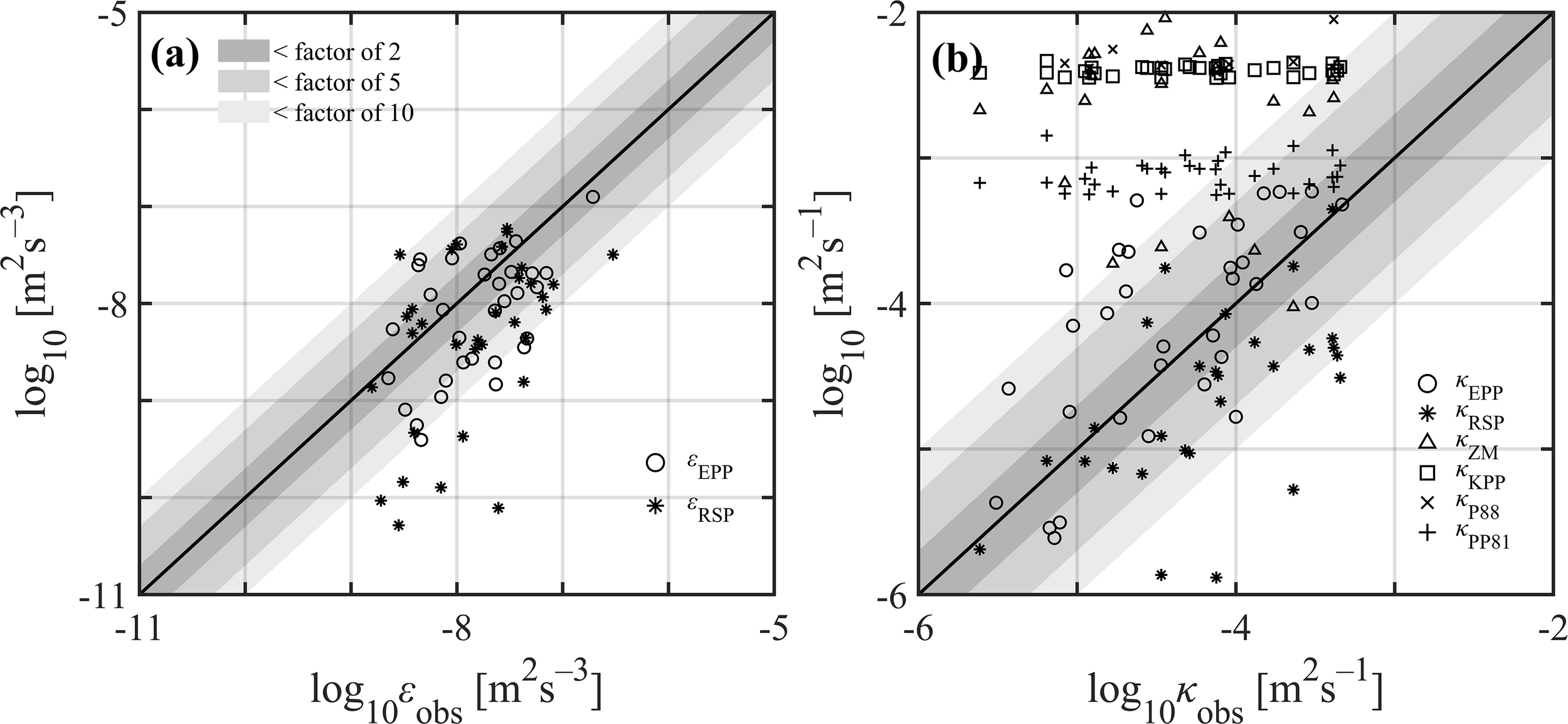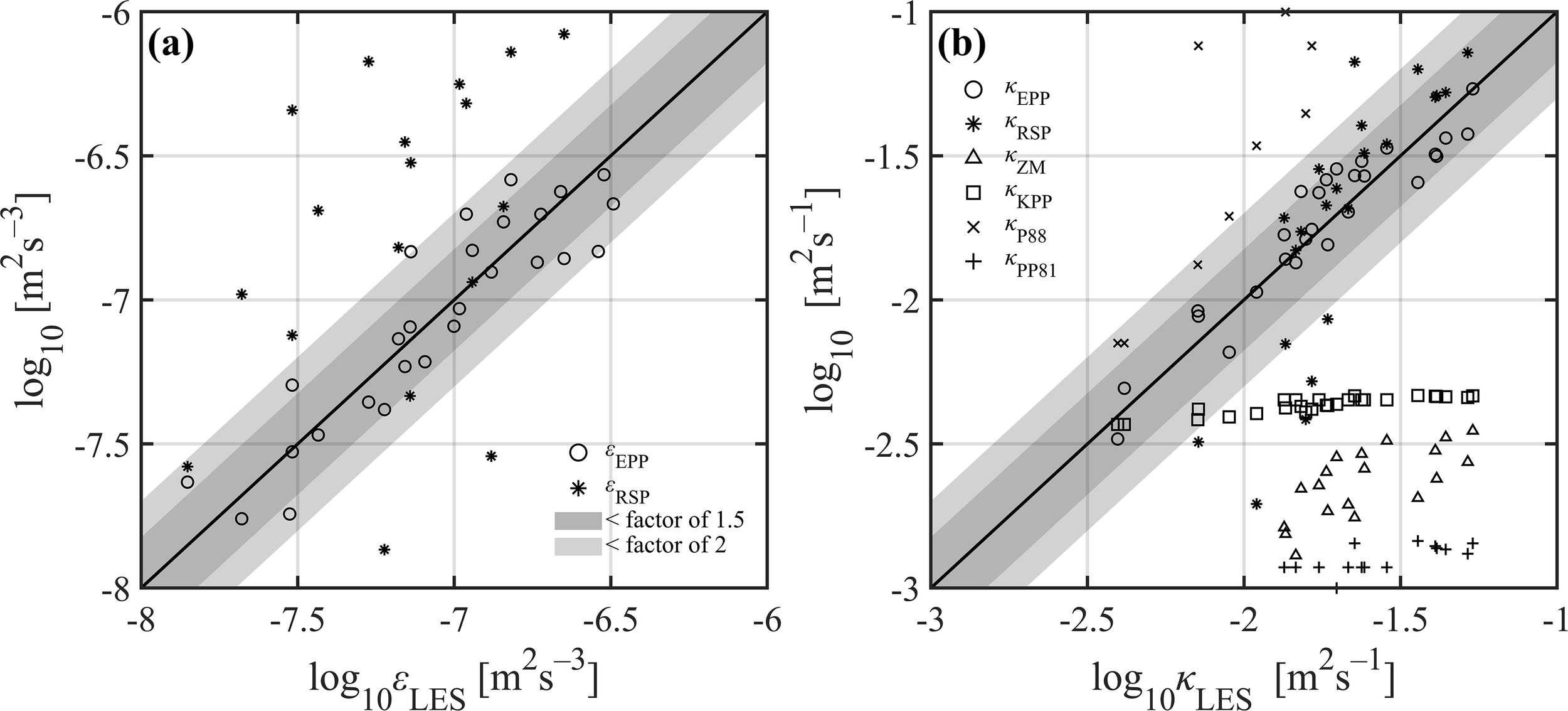 Researchers usually directly apply a parameterization to observed hydrologic data to evaluate its performance. However, we note that it is difficult to fairly evaluate the performance this way. Firstly, observational data often lack the precise background variables that are required to initialize the potential turbulent events, unlike the well-controlled initial conditions in LES experiments. The so-called background fields may also have undergone the influence of prior turbulence. Secondly, the observed mixing coefficients (such as and ) are subject to other larger-scale forces, such as advection and shear production, which is also unlike the freely developed turbulence as seen in LES. Lastly, turbulence observed at an observational site may originate from remote locations rather than local instability.