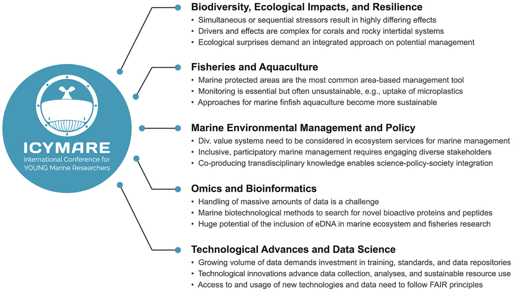 This Research Topic is a collection of original research, review, and perspective articles produced in the frame of the ICYMARE initiative. ICYMARE – the ‘International Conference for Young MArine REsearchers’ – is an annual international conference and networking meeting for young marine scientists (www.icymare.com). As an event of the ‘Bremen Society for Natural Sciences from 1864’ (in German: ‘Naturwissenschaftlicher Verein zu Bremen von 1864’ NWV), it was established in 2019, and is organized and run on a voluntary basis by young marine scientists themselves, empowering the next generation of researchers from the bottom up. This includes the establishment of conference topics. Interested early career researchers apply to a ‘Call for Sessions’, in which Master’s or doctoral students are invited to organize and moderate a conference session as session hosts during the upcoming conference. Thus, the sessions of the conference come from the participants’ own ranks, and they in turn promote the conference topics in their fields of expertise. As the students are working towards their degree, their research often represents cutting-edge developments in the field.