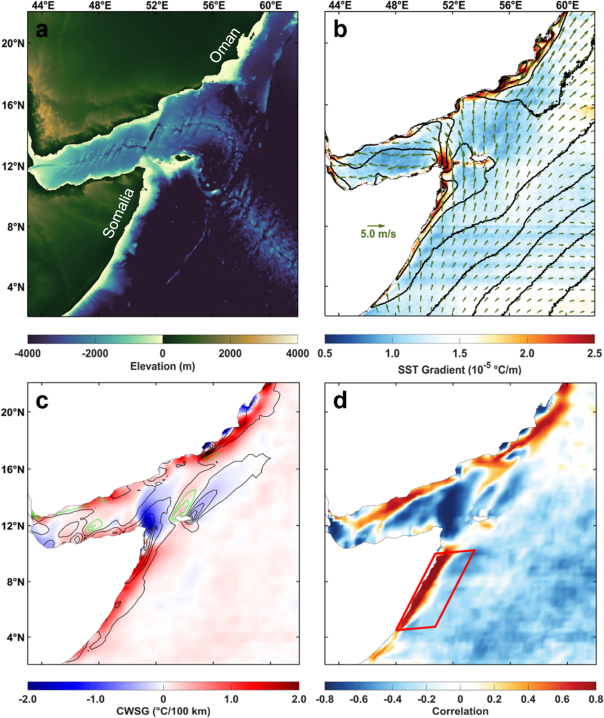 Spatial characteristics of topography, sea surface temperature (SST) gradients, and wind-ocean interaction in the western Arabian Sea. (a) Topographic map of the western Arabian Sea, with elevation and bathymetry (in meters) ranging from –4000 m (deep ocean basins) to 4000 m (high terrain). Color shading represents bathymetry, and major topographic features are labelled. (b) Annual average of SST gradient (°C per 100 km, color shading) with superimposed contours of SST (black lines; 0.5°C intervals) and vector-averaged wind speed (green arrows). (c) Crosswind SST gradient (units: °C per 100 km, shading) overlaid with wind stress curl (WSC) contours (green: negative; black: positive; interval: 2.0 N·m⁻² per 104 km; zero contour omitted). (d) Temporal correlation map between crosswind SST gradient and WSC. The red box outlines the study region.