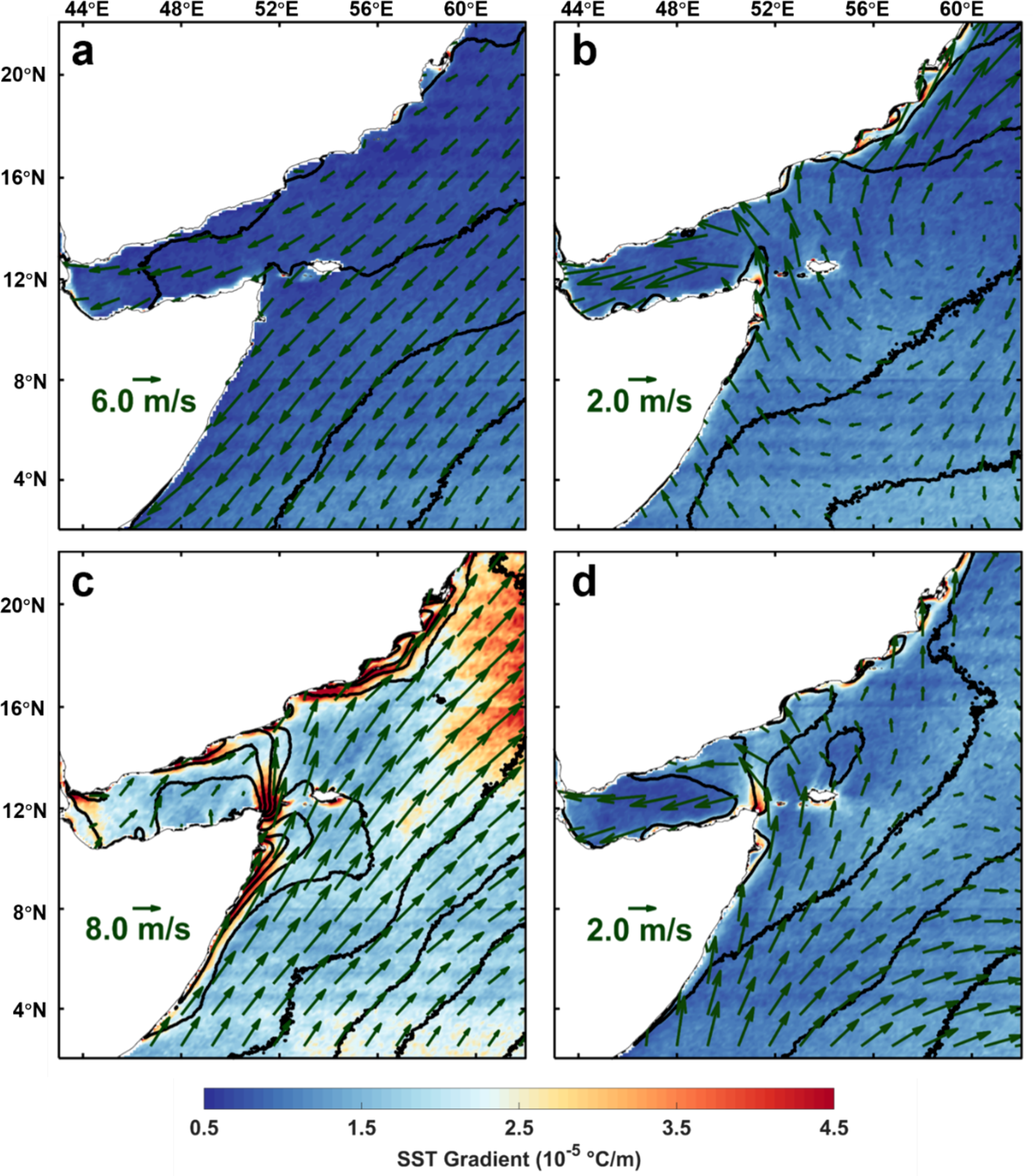 These physical processes are clearly expressed in the spatial distribution of SST anomalies. Notably, the Somalia upwelling front exhibits an exceptionally steep SST gradient (>7 °C per 100 km), indicative of an intense oceanic frontal system that enhances vertical nutrient flux and supports vigorous biological production (Schott et al., 2009; Lakshmi et al., 2020). In contrast, moderate SST gradients were observed off Oman (2–3 °C per 100 km), likely reflecting topographically mediated weakening of monsoon winds (Yi et al., 2018). In the central western Arabian Sea, SST gradients are minimal (<1 °C per 100 km), consistent with regions of wind stress convergence and weak surface forcing that limit vertical mixing and suppress thermal structure. Together, these regional patterns highlight the strong modulation of upwelling by both wind forcing and coastal bathymetry. Moreover, dynamic feedback exists as wind-driven SST gradients reshape ABL stability and in turn alter surface wind fields, reinforcing the complexity of air-sea coupling in the monsoon-dominated western Arabian Sea (Schott et al., 2009; Small et al., 2008).