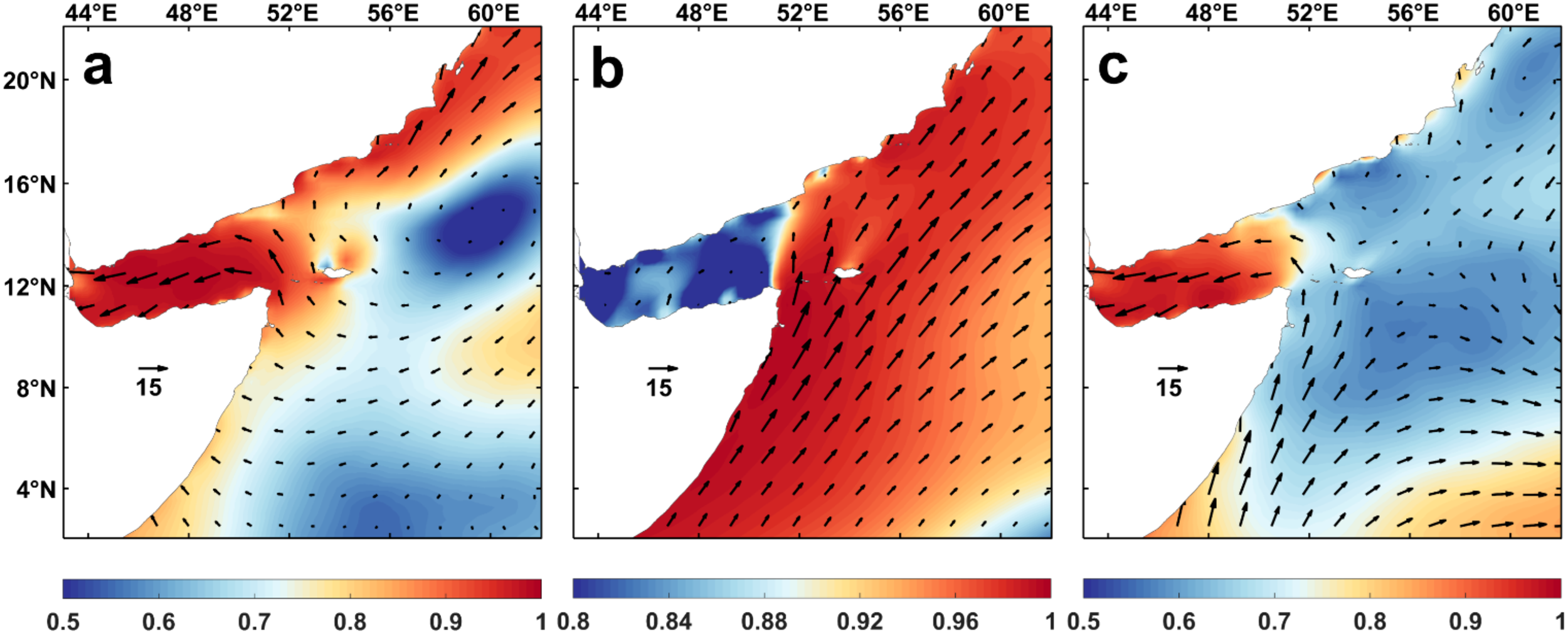 A critical factor modulating mesoscale SST-wind stress coupling is wind stress directional steadiness (WSDS), defined as the ratio of vector-averaged to scalar-averaged wind speed, which reflects the directional stability of surface winds (Chelton et al., 2007; see Equation 4). High WSDS, indicating stable wind directions, enhances SST-wind stress coupling by allowing the ABL to respond more consistently to underlying SST gradients (Chelton et al., 2001; Xie, 2004; Small et al., 2008). For instance, in the Brazil Current region, coupling coefficient is low during the onset of the monsoon but increases substantially as WSDS elevates (Castelao, 2012). Seasonal variations in WSDS have therefore been shown to drive pronounced intra-annual changes in mesoscale coupling intensity (Sun et al., 2020; Yu et al., 2020). In monsoon-dominated systems such as the Arabian Sea, the summer southwest monsoon induces strong coastal upwelling along the coasts of Oman and Somalia (Schott et al., 2009), generating prominent SST fronts that modulate surface winds (Vecchi et al., 2004; Xie, 2004). In contrast, the winter northeast monsoon is less favorable for frontogenesis and associated with weaker mesoscale air-sea interactions (Beal and Donohue, 2013).
