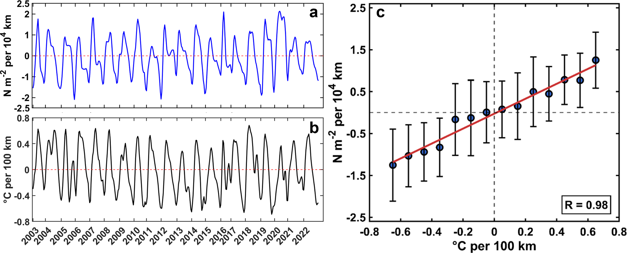 Mesoscale SST-wind stress coupling is most pronounced near oceanic fronts, where cross-frontal SST gradients induce atmospheric boundary layer (ABL) instability. This instability enhances vertical momentum mixing and increases surface wind stress over warmer waters, deepening the ABL and facilitating the downward transfer of momentum from the free atmosphere to the ocean surface, thereby accelerating surface winds (Small et al., 2008; Chelton and Xie, 2010; O’Neill et al., 2010). In contrast, colder waters stabilize the ABL and suppress near-surface winds (Chelton and Xie, 2010). As a result, a positive coupling coefficient between SST and wind stress is predominantly observed in frontal regions of the global ocean (Chelton et al., 2004). This coupling mechanism further generates wind stress curl (WSC) anomalies that are approximately proportional to crosswind SST gradients (CWSG) within frontal zones (Chelton et al., 2001; see Equations 1–3). Coupling coefficients, defined as the regression slope between WSC and CWSG, are commonly used to quantify the strength of the interaction (O’Neill et al., 2010). Observations consistently reveal substantial spatial variability in coupling coefficients across the global ocean (Wang and Castelao, 2016).