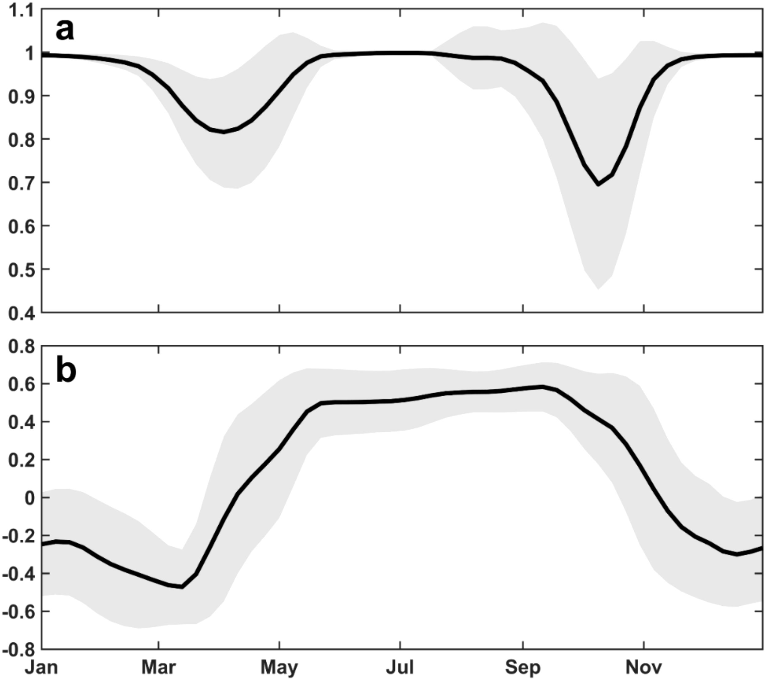 Time series of (a) averaged WSDS and (b) the coupling coefficients between WSC and the crosswind SST gradient in the western Arabian Sea (see the box in Figure 1d). The shading in both panels represents the standard deviation calculated from multi-year data for the corresponding time of year.
