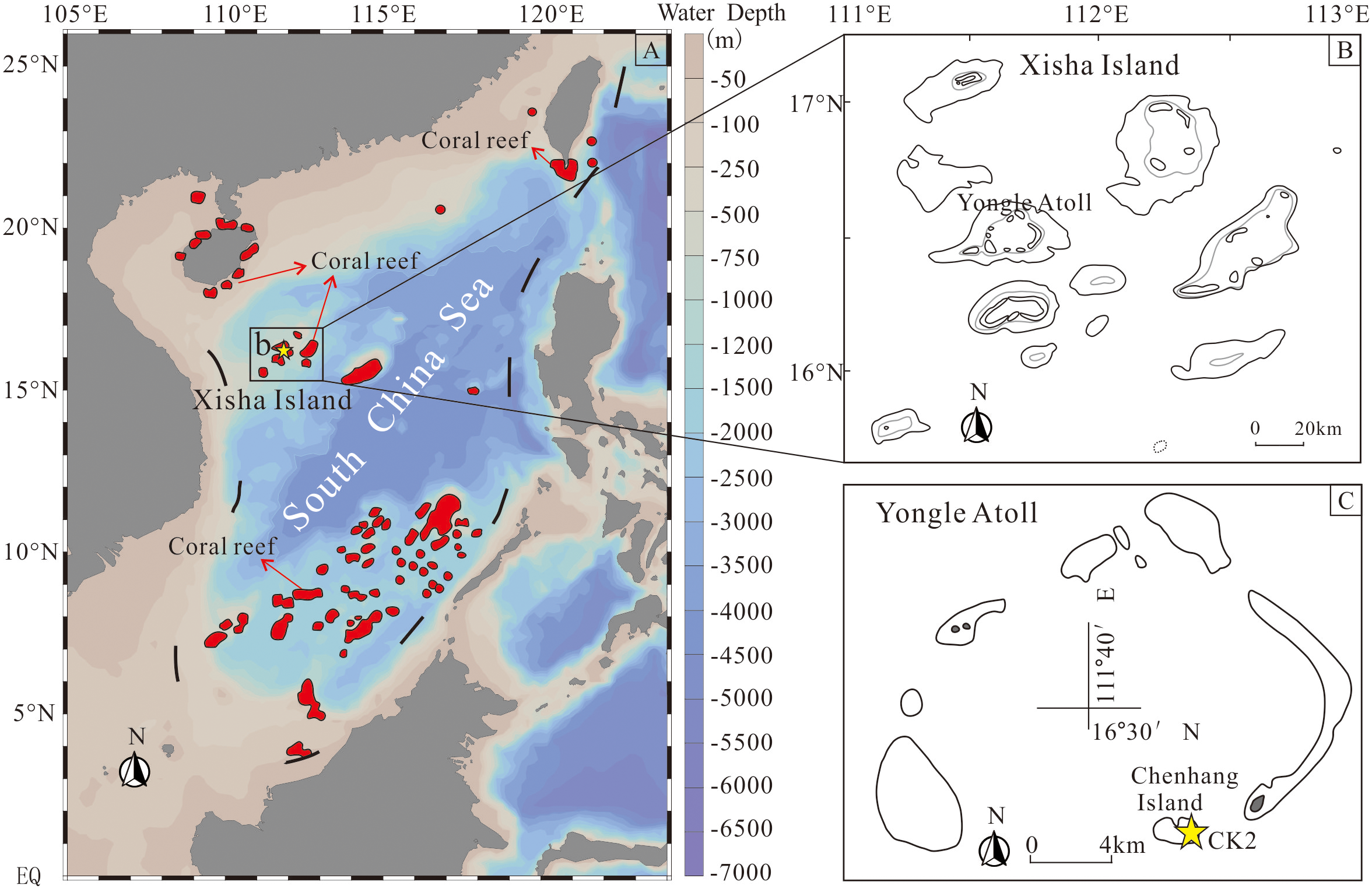Geological map of the South China Sea and the sample location of CK2. (A) Map of the South China Sea Coral reef distribution (red zones, modified from Wang et al., 2014). (B) Map of Xisha Islands. (C) Map of Yongle Atoll and the location of CK2.