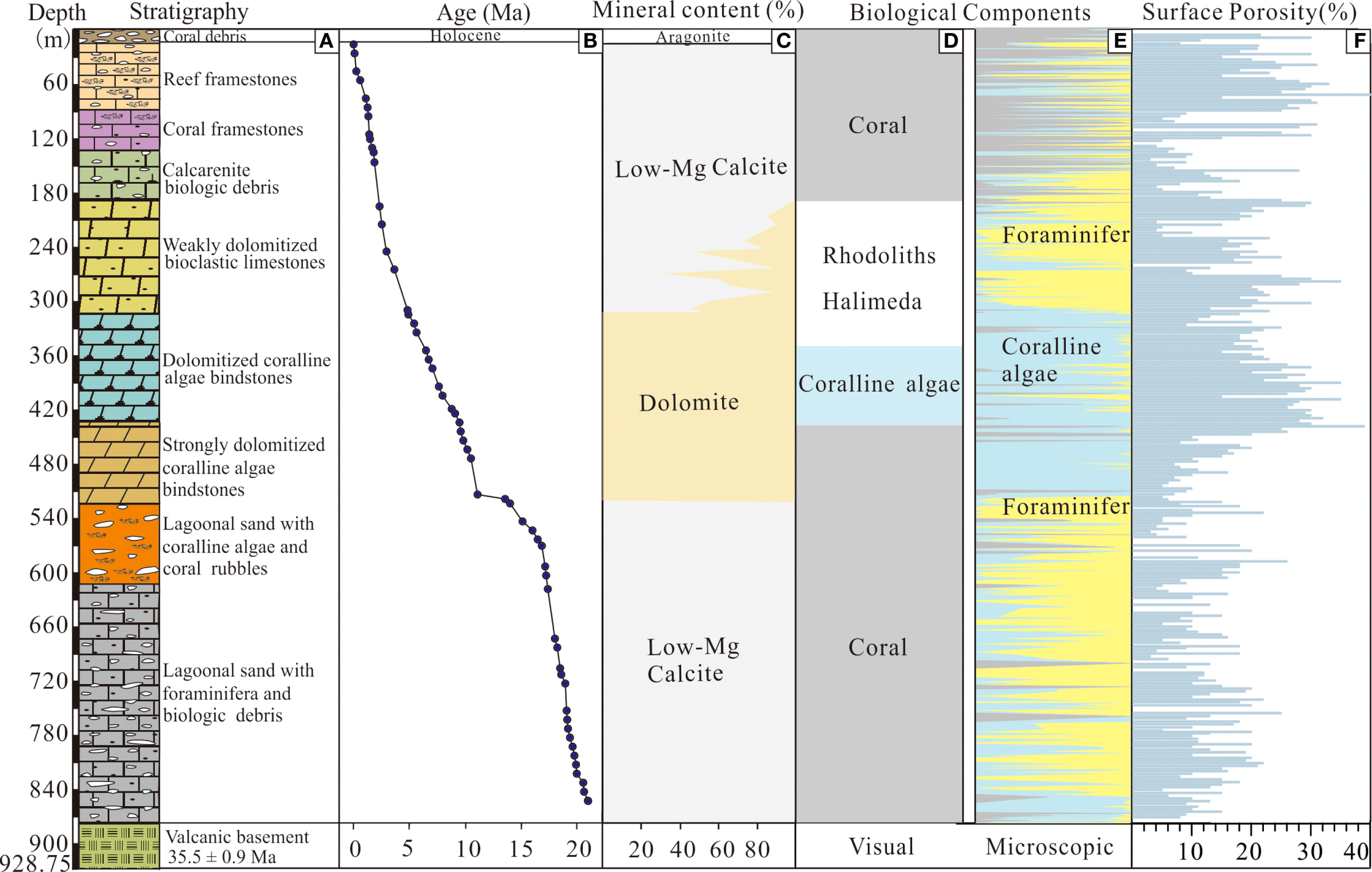 Geological characteristics of CK2: (A) Stratigraphy; (B) Chronological framework; (C) Mineral composition; (D) Visual-inspected biota; (E) Microscope-observed biota; (F) Surface porosity.