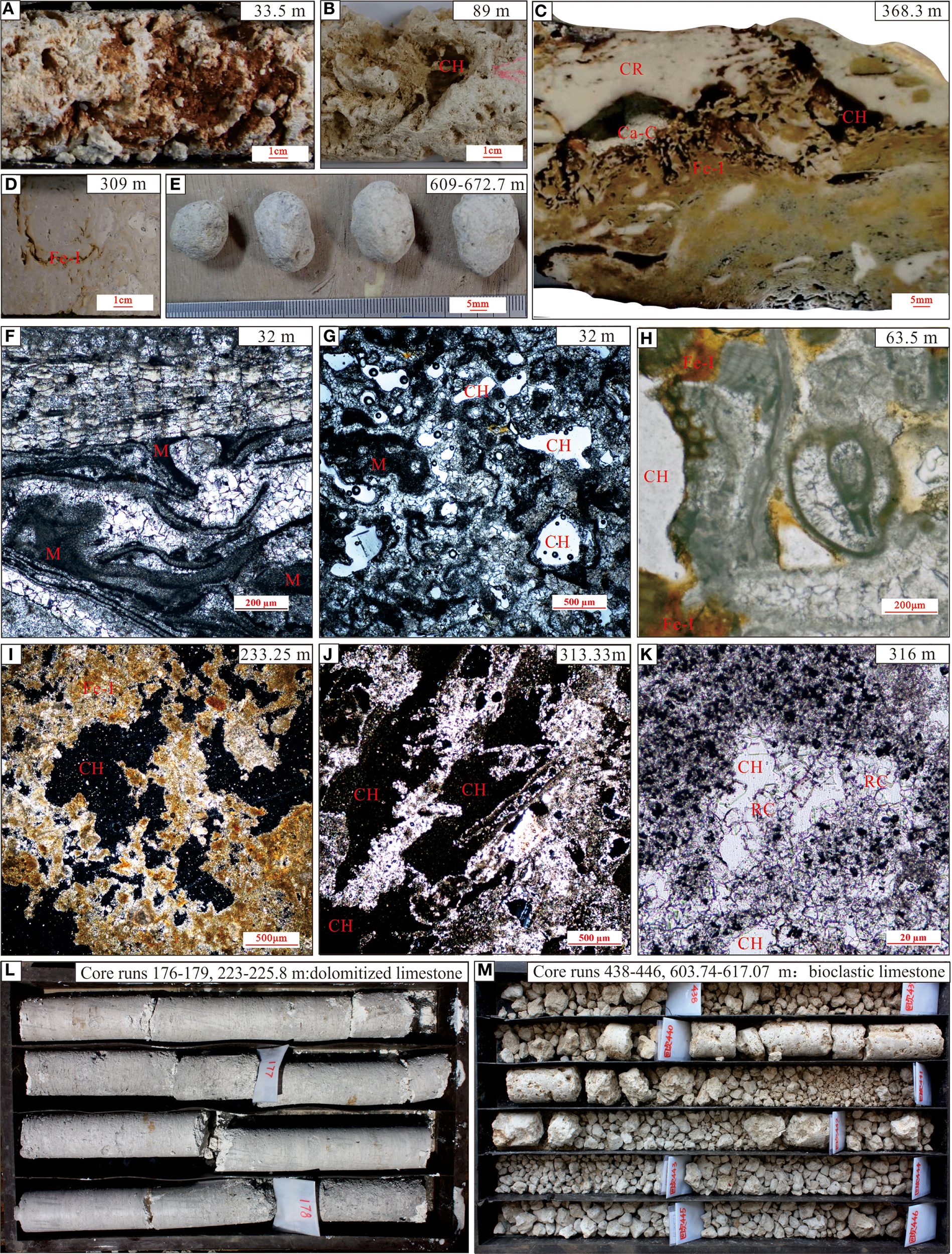 Characteristics of coral reef carbonate karstification and initial core samples in CK2: (A–D) Dissolution vugs and Fe-impregnated with reddish-brown calcareous crust of core samples; (E) Well-rounded and well-sorted coral fragments; (F, G) Cementation textures; (H, I) Dissolution pores with ferric impregnation; (J, K) Dissolution pores and recrystallized calcite; (L, M) Initial core samples. CH, corrosion cavern; CR, coral reef; M, micrite; RC, recrystallization; II, Fe infection.