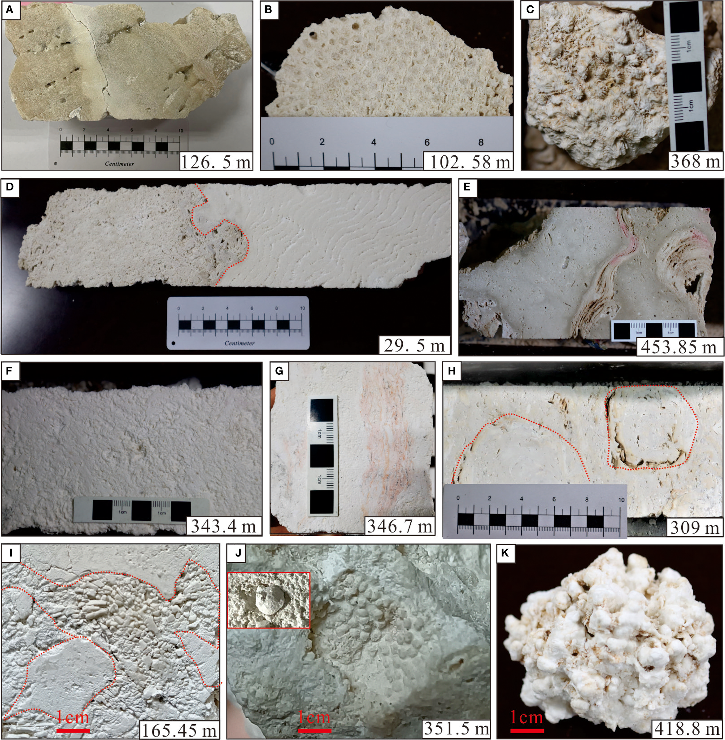The CK2 reef sequence is primarily composed of corals, coralline algae, rhodoliths, Halimeda, foraminifera, and shell fragments (Figure 5). Corals occur throughout the core, with diverse taxa including Porites, Galaxea, and Acropora, but they dominate as the principal framework builders in two intervals: 0–190 m and 434.66–878.2 m. In the upper interval (0–190 m), corals mainly exist as reef framestones and rubble, while in the lower interval (434.66–611 m), they primarily form reef frameworks. Below 611 m to 878.2 m, they predominantly appear as rubble, often encrusted by coralline algae.Coralline algae constitute the second most important reef-building component after corals, chiefly represented by rhodoliths and laminar coralline algae. These are particularly abundant in 190–434.66 m (Figures 4–8), with 190–362 m dominated by rhodoliths and Halimeda beds, and 362–434.66 m dominated by rhodoliths and laminar coralline algae. Additionally, foraminifera, as accessory reef dwellers, are widely distributed throughout the core, with particularly high concentrations in 180–310 m and 525–878.22 m.